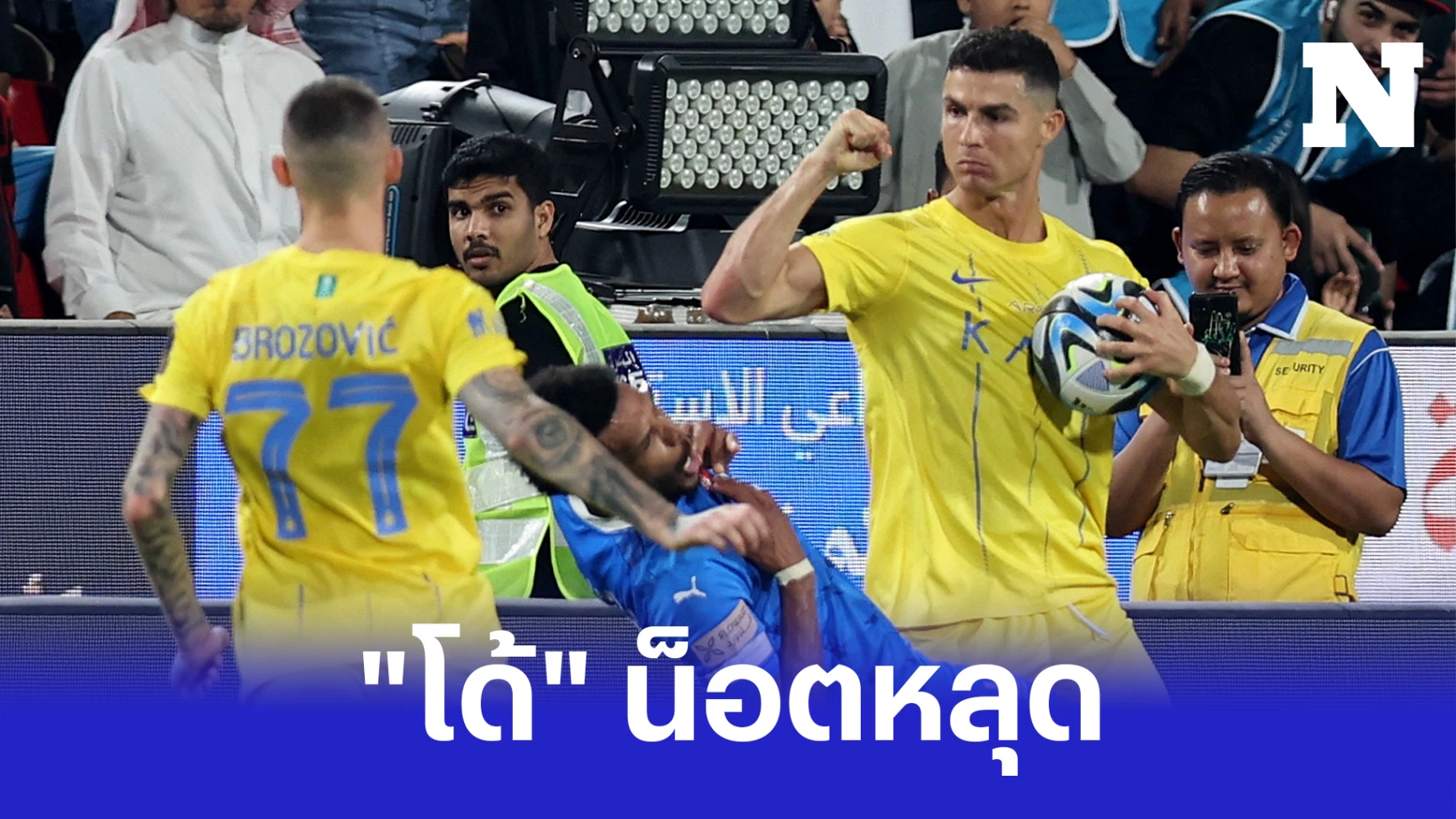 นาทีที่ 89 คริสเตียโน่ โรนัลโด้ ที่เกมนี้เล่นไม่ออก เกิดคุมอารมณ์ไม่อยู่จากจังหวะพยายามทุ่มบอลเร็วแต่โดนขวางไว้ เลยไปชักศอกใส่ผู้เล่นของ อัล ฮิลาล จนล้มทั้งยืน ผู้ตัดสินแจกใบแดงไล่ออกจากสนามทันที เท่านั้นยังไม่พอ "โด้" ยังง้างหมัดเกือบชกบอลใส่กรรมการเพื่อระบายอารมณ์ แต่ยังดีที่ยั้งตัวเองไว้ได้ อย่างไรก็ตามระหว่างเดินออกจากสนามเจ้าตัวก็ปรบมือประชดเชิ้ตดำอีกด้วย