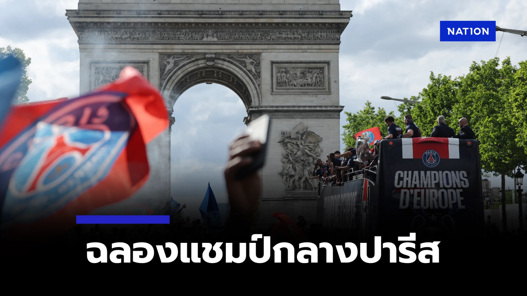 ก่อนหน้านี้ในช่วงบ่ายวันอาทิตย์ เปแอสเช ได้จัดขบวนรถบัสเปิดประทุนวิ่งผ่านถนนฌ็องเซลิเซ่ พร้อมเสียงเชียร์และธงแดง-น้ำเงินจากแฟนบอลนับแสนที่มารอรับนักเตะตั้งแต่ก่อนเวลา 17.00 น.