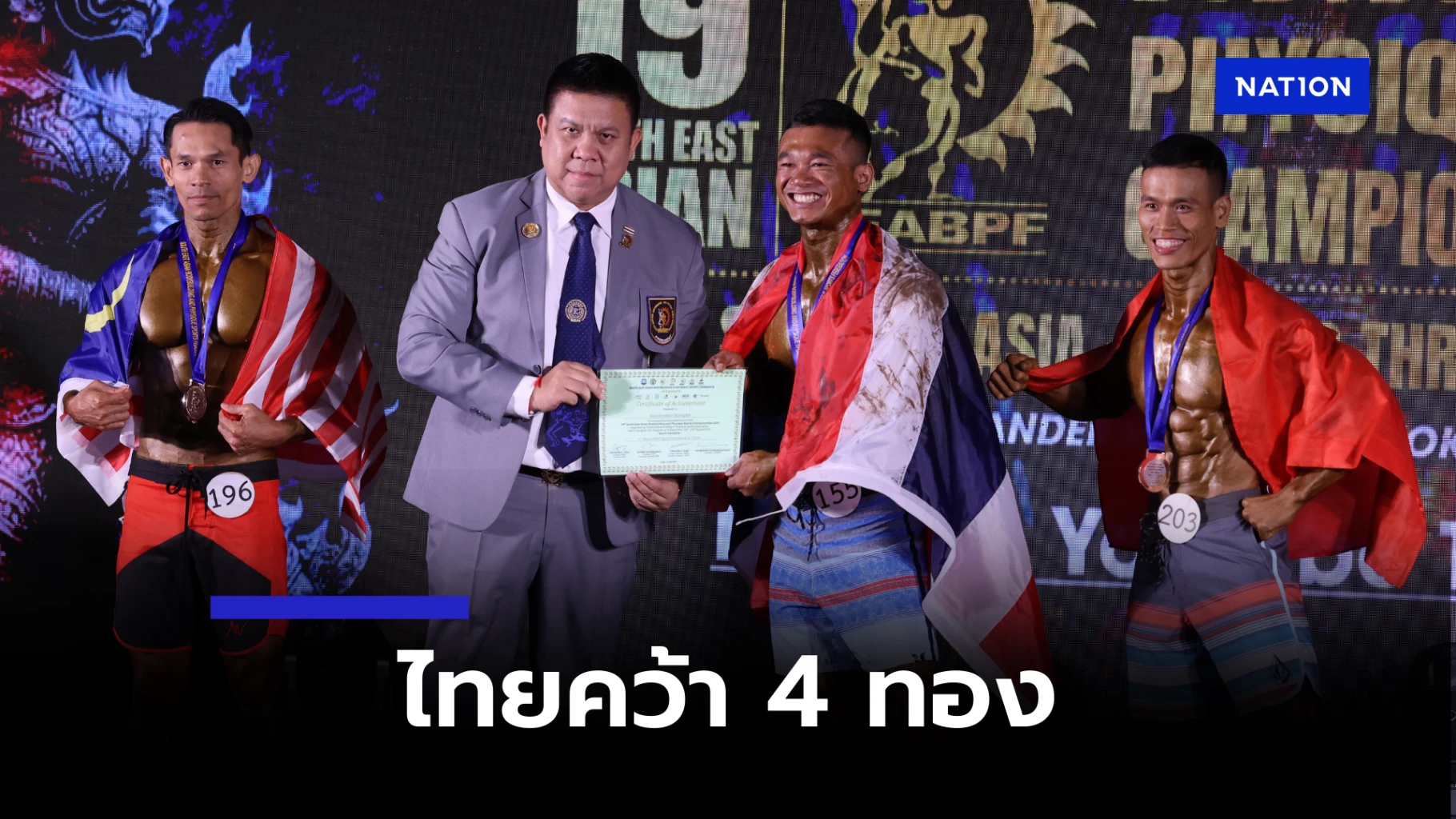 ทัพนักกีฬาเพาะกายและฟิตเนสทีมชาติไทยโชว์ฟอร์มได้อย่างแข็งแกร่งในศึกเพาะกายและฟิตเนสชิงชนะเลิศแห่งเอเชียตะวันออกเฉียงใต้ ครั้งที่ 19 ณ โรงแรมอเล็กซานเดอร์ กรุงเทพมหานคร โดยสามารถคว้ามาได้ 4 เหรียญทอง 5 เหรียญเงิน และ 2 เหรียญทองแดง พร้อมกับการแจ้งเกิดของนักกีฬาหน้าใหม่ถึง 4 คน