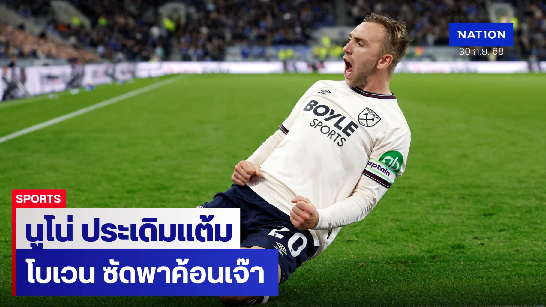 จาร็อด โบเวน ปีกตัวเก่งของ เวสต์แฮม ยูไนเต็ด กลายเป็นผู้เล่นทีมเยือนคนแรกที่ทำประตูได้ที่สนาม ฮิลล์ ดิกคินสัน สเตเดียม รังเหย้าแห่งใหม่ของ เอฟเวอร์ตัน โดยลูกยิงแฉลบของเขาช่วยให้ "ขุนค้อน" บุกไปเสมอ "ทอฟฟี่สีน้ำเงิน" 1-1 ในศึก พรีเมียร์ลีก ทำให้ นูโน่ เอสปิริโต้ ซานโต กุนซือคนใหม่ของเวสต์แฮมประเดิมการคุมทีมด้วยการเก็บ 1 แต้ม