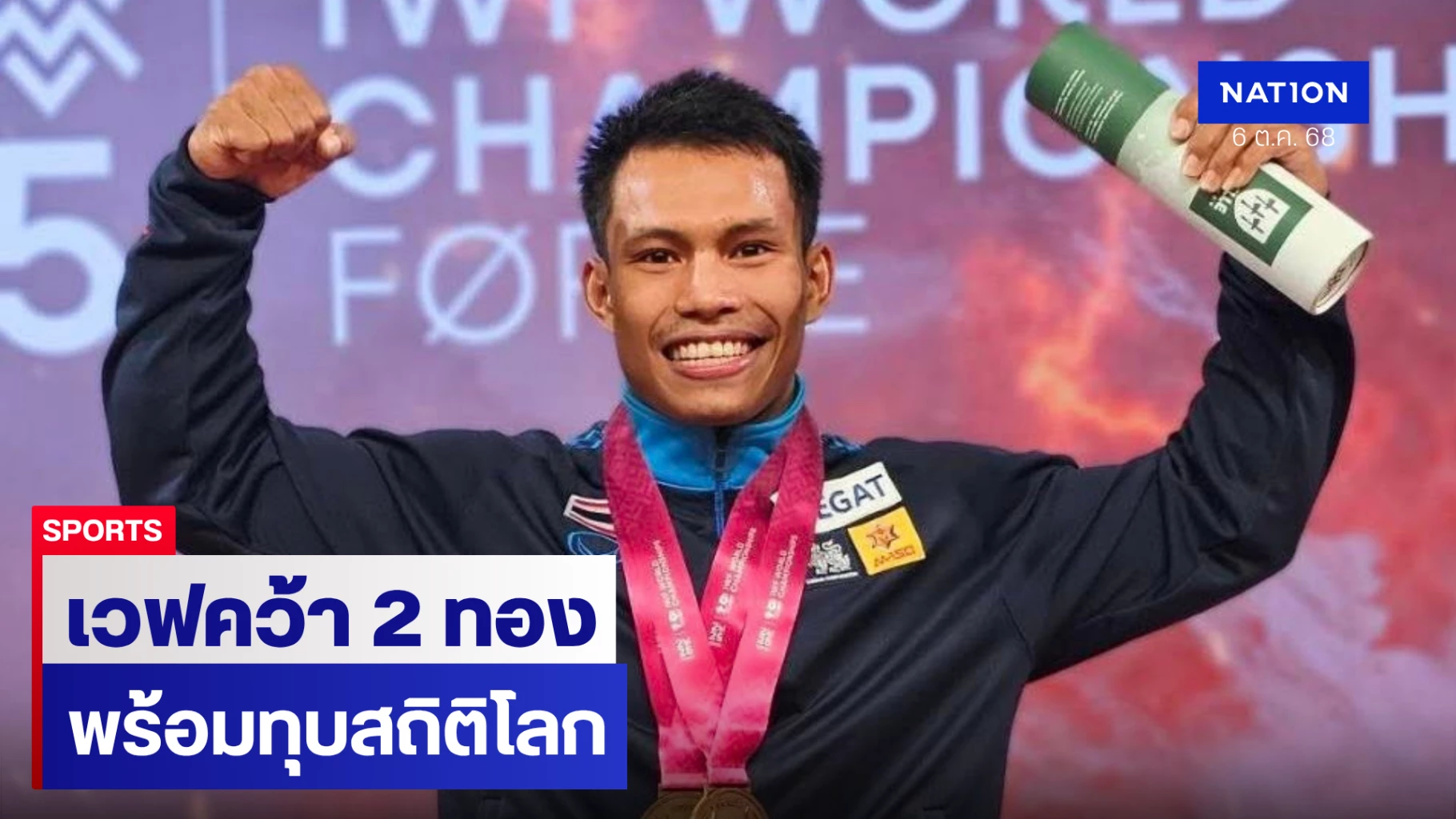 "เวฟ" จ่าอากาศตรี วีรพล วิชุมา ยอดนักยกน้ำหนักดีกรีเหรียญเงินโอลิมปิกเกมส์ “ปารีส 2024” สร้างผลงานสุดสะท้านโลกให้กับทัพจอมพลังไทย ด้วยการคว้า 2 เหรียญทอง ในรุ่น 71 กิโลกรัม ชาย พร้อมทำลาย สถิติโลก ทั้งในท่าคลีนแอนด์เจิร์กและน้ำหนักรวม ในศึก ยกน้ำหนักชิงชนะเลิศแห่งโลก ประจำปี 2568 ที่เมืองฟอร์ด ประเทศนอร์เวย์