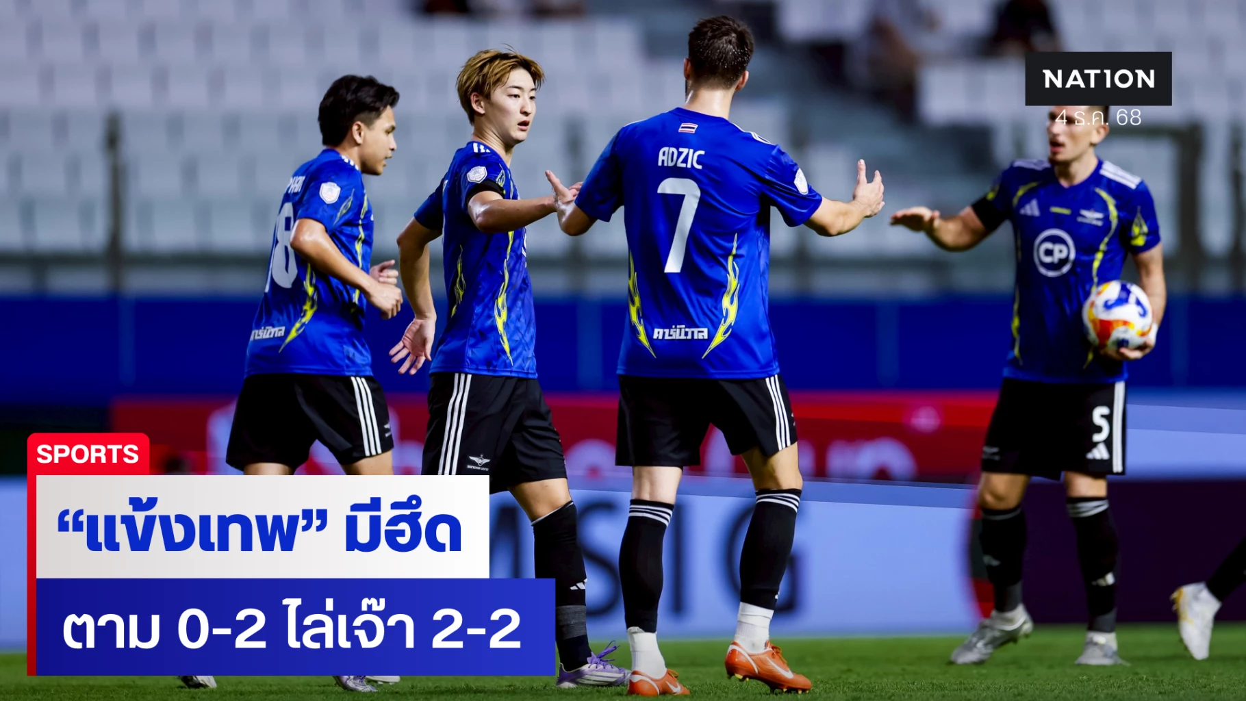 "แข้งเทพ" ทรู แบงค็อก ยูไนเต็ด เปิดบ้าน ทรู บีจี สเตเดี้ยม ทำศึกฟุตบอลชิงแชมป์สโมสรอาเซียน “Shopee Cup 2025/26” กลุ่มบี นัดที่ 3 เมื่อวันพฤหัสบดีที่ 4 พฤศจิกายน 2568 โดยถูก ไลออน ซิตี้ เซเลอร์ส จากสิงคโปร์ นำไปก่อน 0-2 แต่สุดท้ายฮึดสู้กลับมาตีเสมอได้สำเร็จ 2-2 แบ่งกันไปคนละ 1 คะแนน