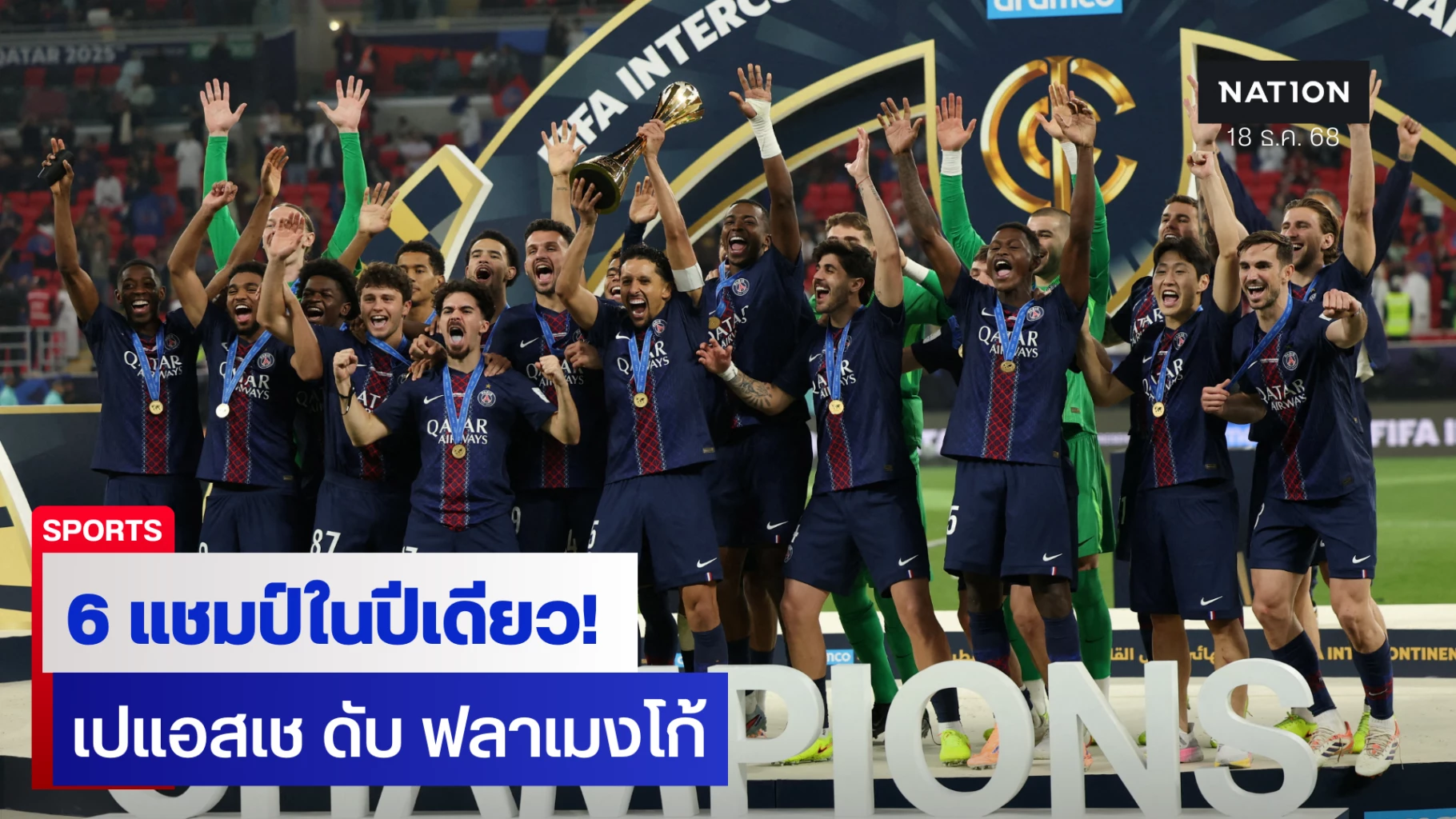 ปารีส แซงต์-แชร์แมง ยอดทีมจากฝรั่งเศส ประกาศศักดาครองความยิ่งใหญ่ในระดับโลก หลังเอาชนะ ฟลาเมงโก้ ทีมแกร่งจากบราซิล ในการดวลจุดโทษตัดสินศึก อินเตอร์คอนติเนนตัล คัพ 2025 รอบชิงชนะเลิศ ณ สนามอาหมัด บิน อาลี สเตเดียม ประเทศกาตาร์ เมื่อวันพุธที่ผ่านมา คว้าแชมป์รายการที่ 6 ประจำปี 2025 ได้สำเร็จ