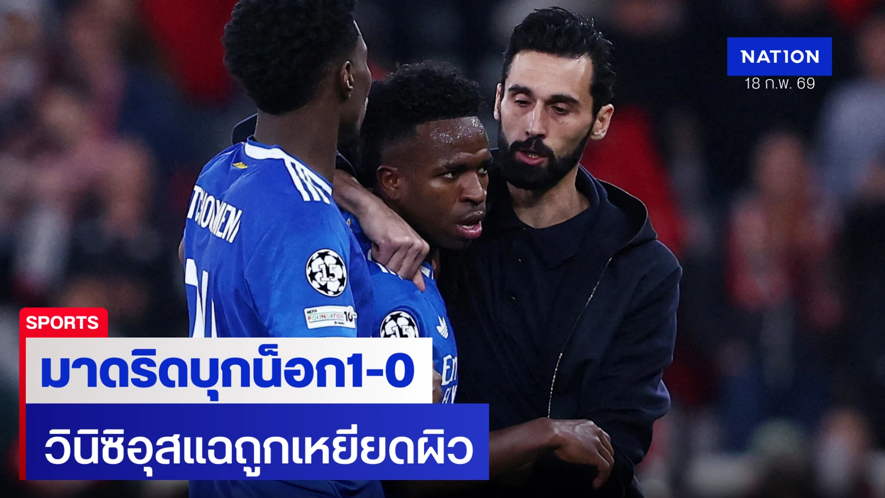 เรอัล มาดริด แชมป์ยุโรป 15 สมัย กุมความได้เปรียบในนัดแรกหลังบุกไปเฉือนชนะ เบนฟิก้า 1-0 ณ สนามเอสตาดิโอ ดา ลุซ จากลูกยิงสุดสวยของ วินิซิอุส จูเนียร์ ที่ซัดเสียบสามเหลี่ยมอย่างงดงาม อย่างไรก็ตาม เกมต้องหยุดชะงักลงราว 10 นาทีเมื่อดาวเตะบราซิลเลียนแจ้งต่อผู้ตัดสิน ฟรองซัวส์ เลเต็กซิเยร์ ว่าเขาถูกผู้เล่นฝ่ายตรงข้ามเหยียดผิวระหว่างการแข่งขัน