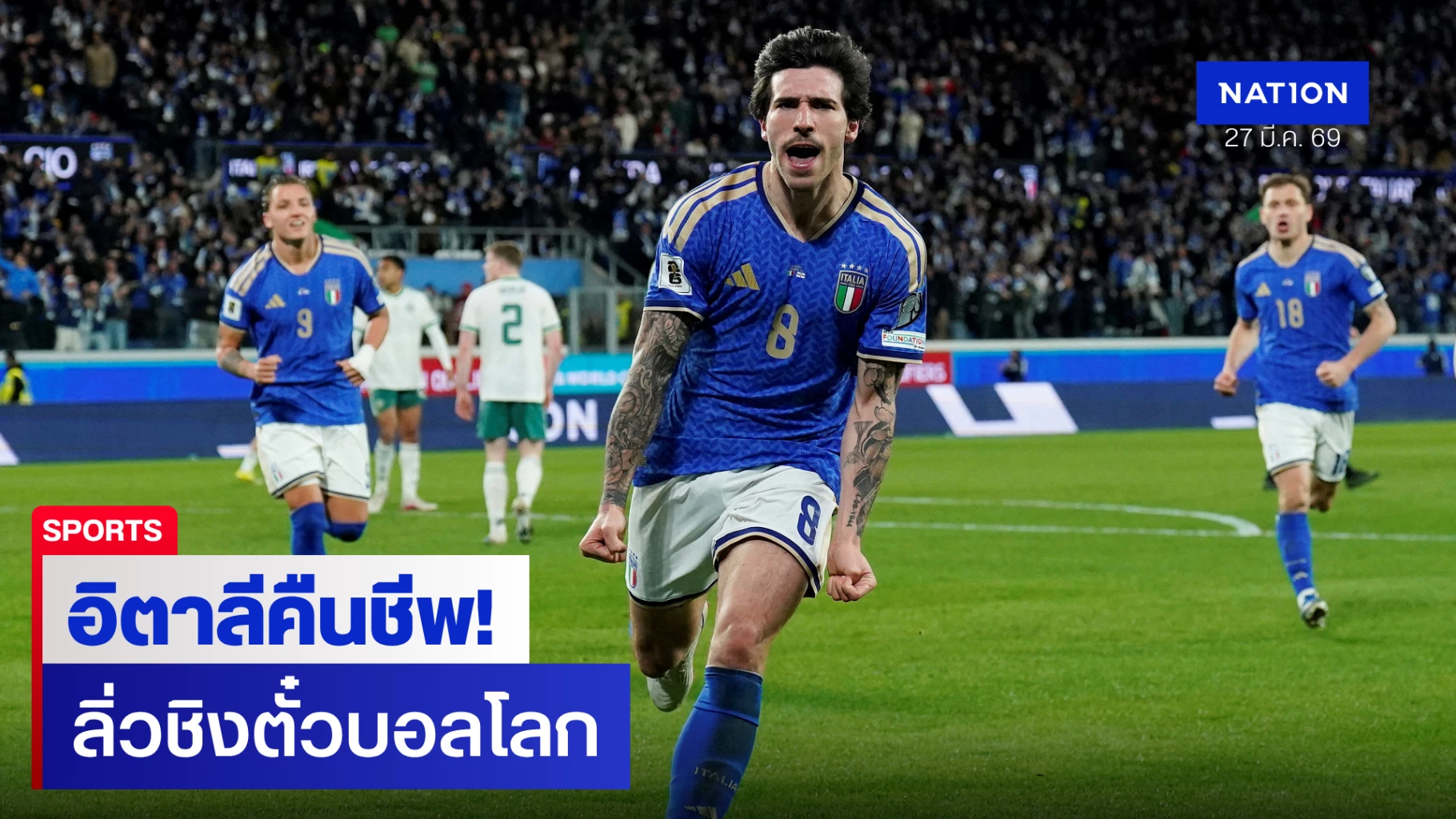 ทัพ "อัซซูรี่" ทีมชาติอิตาลี แชมป์โลก 4 สมัย กลับมามีความหวังอีกครั้งหลังเปิดบ้านเอาชนะ ไอร์แลนด์เหนือ 2-0 ในศึกเพลย์ออฟรอบรองชนะเลิศ เมื่อคืนวันพฤหัสบดีที่ผ่านมา โดยได้ประตูเบิกร่องจาก ซานโดร โตนาลี ในช่วงต้นครึ่งหลัง ก่อนที่โตนาลีจะทำแอสซิสต์ให้ มอยเซ่ คีน ซัดปิดกล่อง