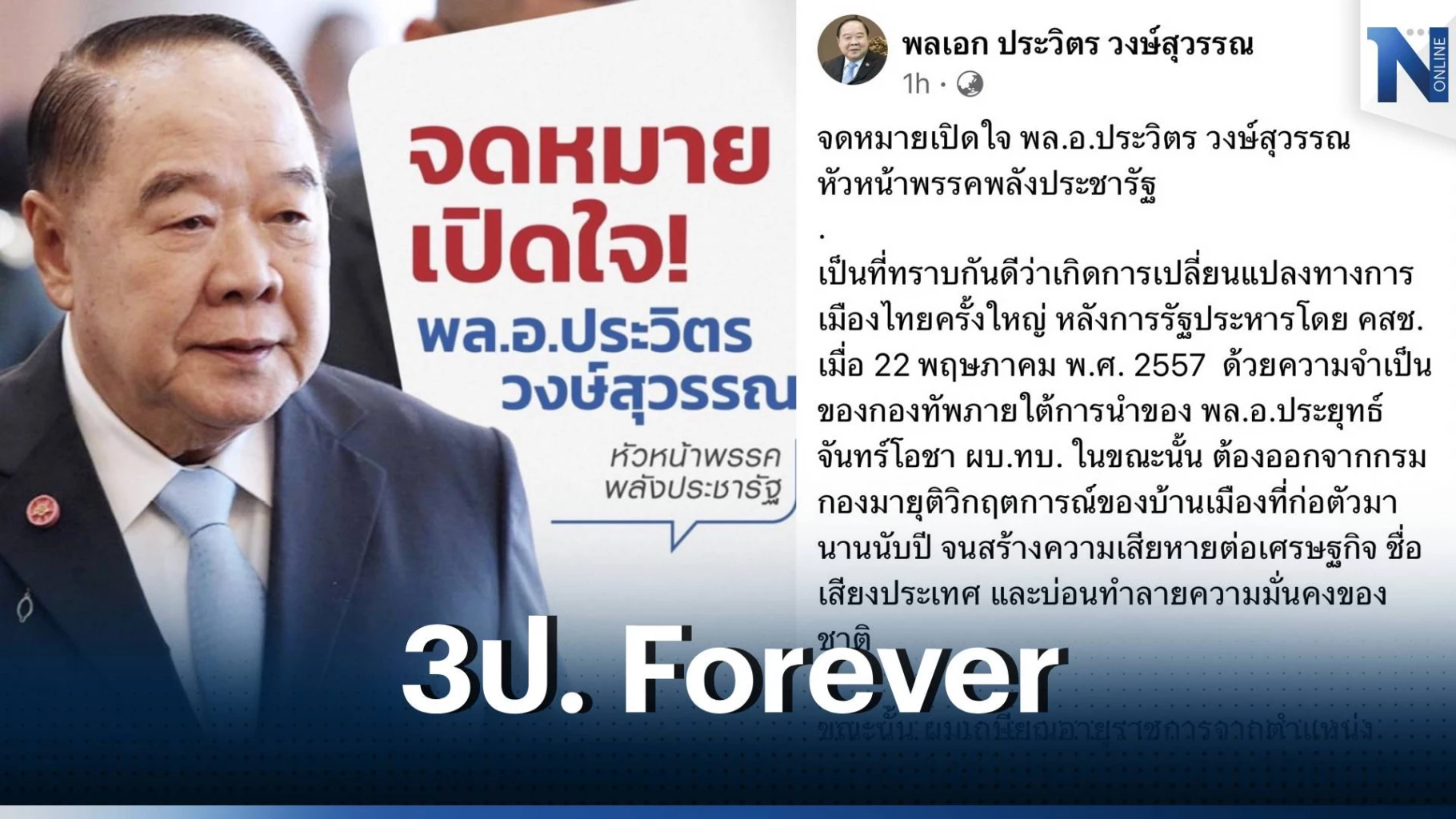 ผมเคยกล่าวไว้ว่า “3 ป. Forever” มาวันนี้ ผมก็ยังมีความรู้สึกเช่นเดิม ไม่เปลี่ยนแปลง แต่ในเมื่อท่านตัดสินใจเด็ดขาดแล้ว ผมก็ไม่สามารถจะบรรยายความรู้สึกออกมาเป็นคำพูดได้ คงจะบอกได้เพียงว่า ผมขอแสดงความยินดีกับท่านด้วย ขอให้ประสบความสำเร็จบนเส้นทางการเมืองใหม่ที่ท่านได้ตัดสินใจเลือกแล้ว
