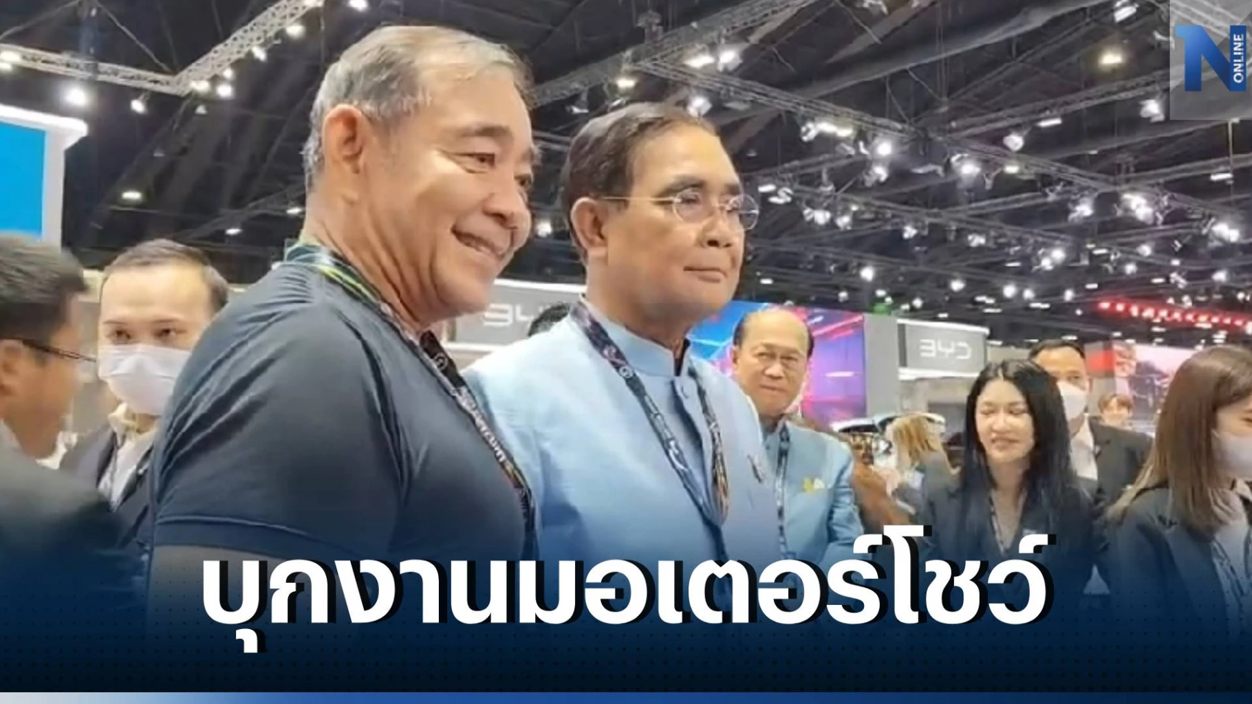 ผู้สื่อข่าวได้สอบถามว่าทำไมนายกรัฐมนตรีถึงเดินเร็ว นายกรัฐมนตรี จึงตอบติดตลกว่า เดี๋ยวพวกเธอจะหาว่าฉันดูแต่พริตตี้ และเมื่อมาถึงบูธมอเตอร์ไซค์ ยี่ห้อ Harley ซึ่งเป็นรถยนต์จักรยานยนต์ที่นายกรัฐมนตรีชื่นชอบ โดยนายกรัฐมนตรี ได้ทดลองนั่งรถจักรยานยนต์คันดังกล่าว พร้อมกับกล่าวว่า เมื่อยแต่เทห์ จากนั้นได้ ทดลองนั่งมอเตอร์ไซค์บิ๊กไบค์ Honda ซึ่งเป็นคันใหญ่ทำให้การก้าวขาลงค่อนข้างลำบาก นายกรัฐมนตรีจึงหันมาแซวสื่อมวลชนว่า พวกเธอก็จับตาดูฉันอยู่น่ะสิ ขอให้สื่อมาลองขึ้นดูบ้างสิ