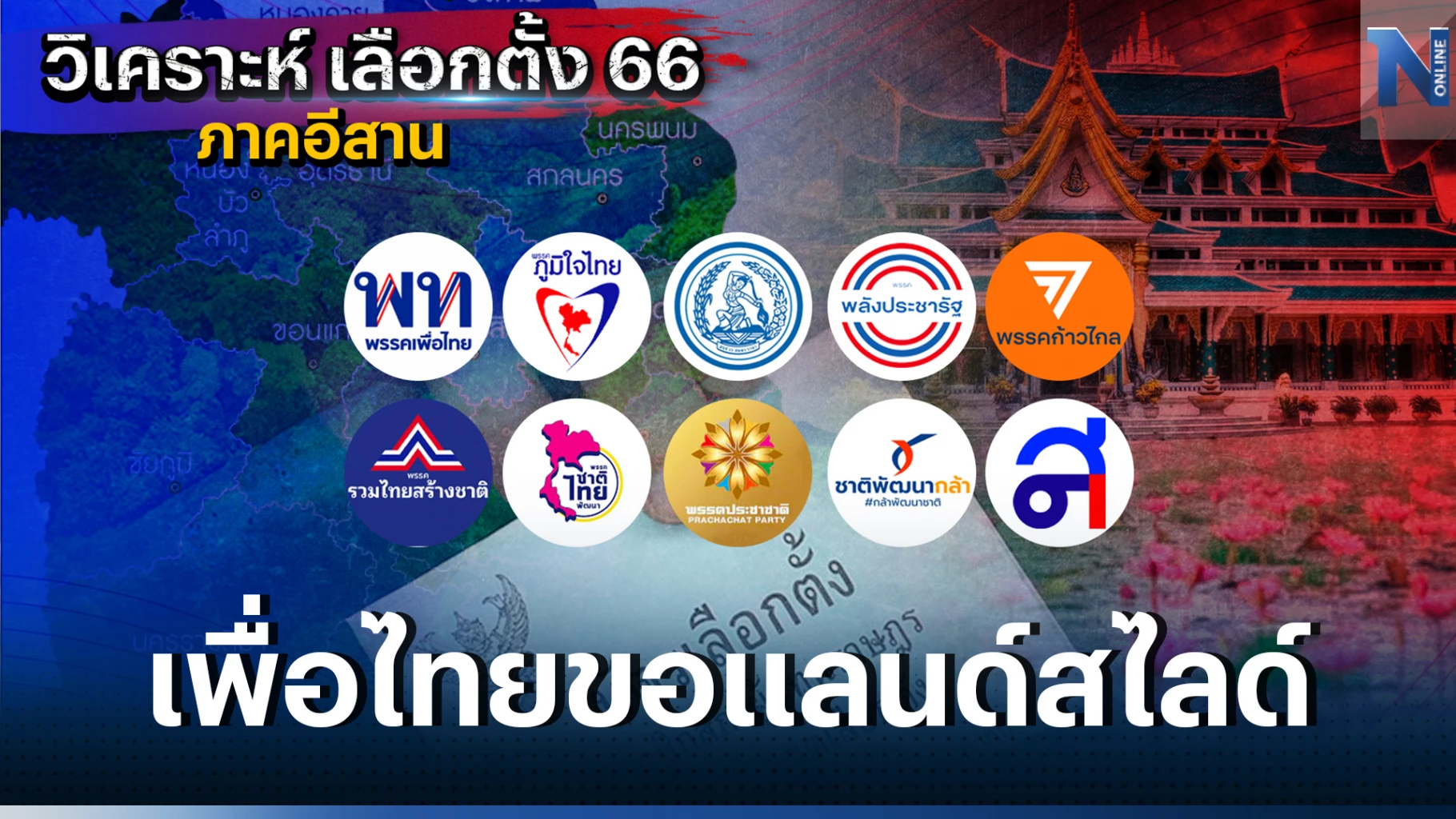 เพื่อไทยหวังแลนสไลด์ยกจังหวัด แต่คราวนี้ไม่แน่ หลายพรรคการเมืองหวังปักธง ทั้งพรรคไทยสร้างไทย ก้าวไกล รวมไทยสร้างชาติ และพรรคพลังประชารัฐ ซึ่งคอการเมืองจับตากันอย่างใกล้ชิด เพราะแต่ละพรรคมีสิทธิ์ได้ลุ้นทั้งนั้นในการเลือกตั้งครั้งนี้