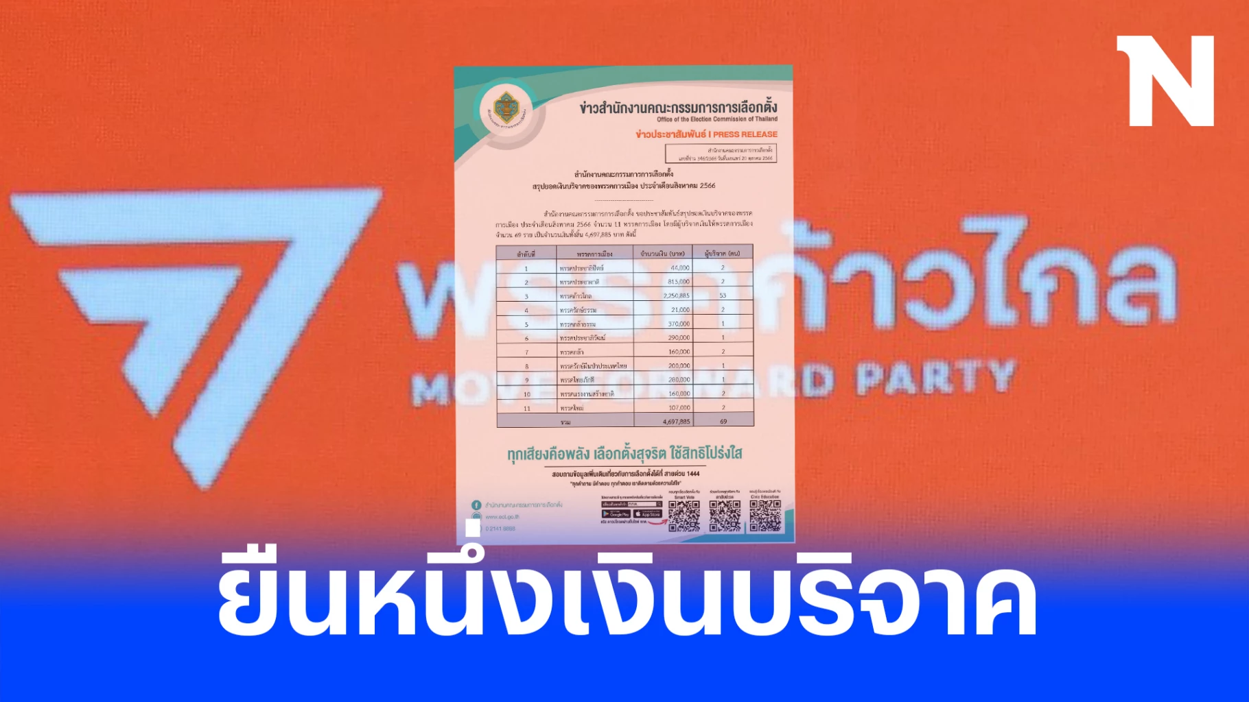 "พรรคก้าวไกล" ยังยืนหนึ่งรับเงินบริจาคเดือนส.ค.กว่า 2 ล้าน จาก 53 คน