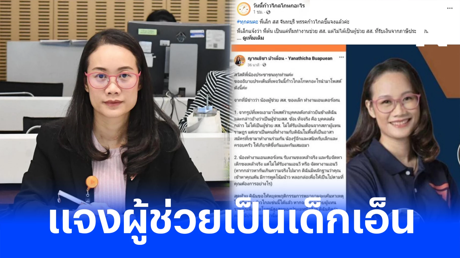 สวัสดีพี่น้องประชาชนทุกท่านค่ะ ขออธิบายประเด็นที่เพจวันนี้ก้าวไกลโกหกอะไรนำมาโพสต์ดังนี้ค่ะ จากที่มีข่าวว่า น้องผู้ช่วย สส. ของเล็ก ทำงานเอนเตอร์เทนเนอร์