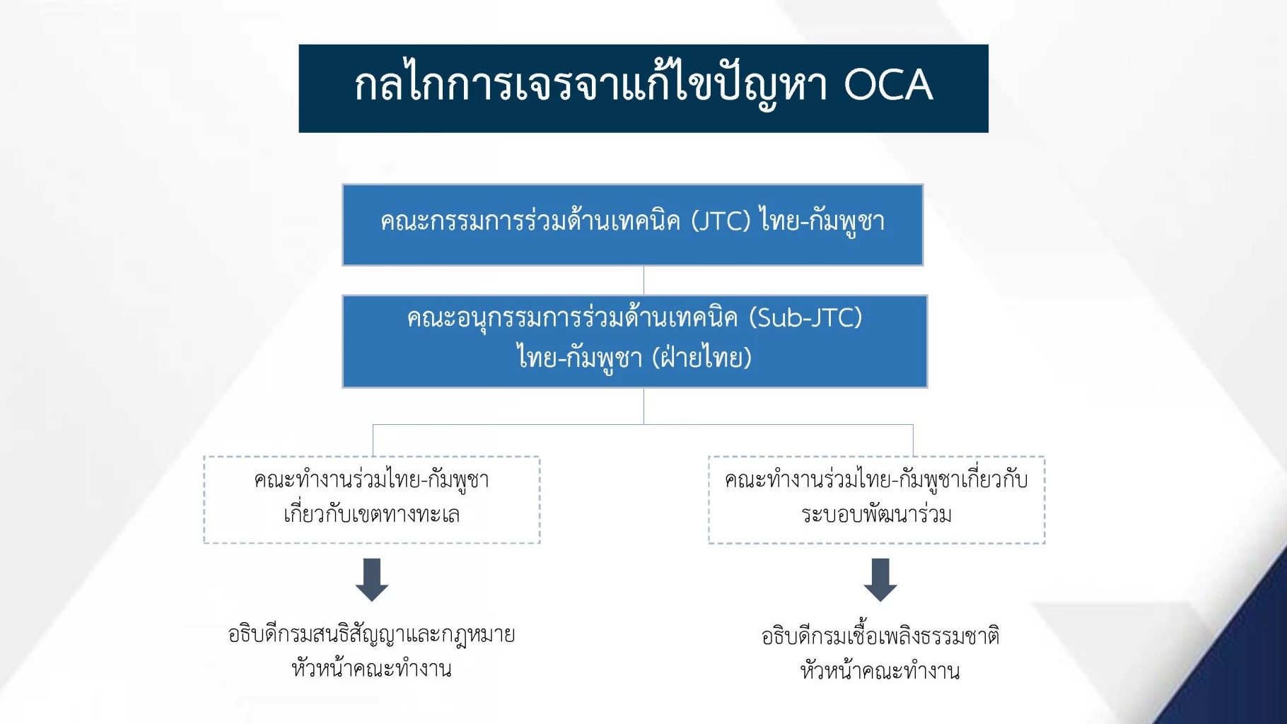 ทั้งนี้ OCA เกิดขึ้น จากกรณีที่มีการประกาศอ้างสิทธิพื้นที่เขตไหล่ทวีป ซึ่งกัมพูชา ได้มีการประกาศอ้างสิทธิในปี 2515 ทั้งที่มีการเจรจากันตั้งแต่ปี 2513 แล้ว แต่ไทยไม่สามารถยอมรับการอ้างสิทธิดังกล่าวได้ เพราะเส้นผ่านไปที่เกาะกูดของประเทศไทย ประเทศไทยจึงได้ประกาศอ้างสิทธิเขตไหล่ทวีปในปี 2516 และรับทราบแล้วว่า จะเป็นการอ้างสิทธิทับซ้อนกัน ทั้งนี้ ก็เพื่อให้มีการไปเจรจากันต่อไป เพื่อให้เกิดความชัดเจน ซึ่งประเทศไทย เคยประสบความสำเร็จในการเจรจากับเวียดนาม และมาเลเซียบางส่วนมาแล้ว ทำให้เมื่อมีความชัดเจนเกิดขึ้น ก็สามารถบริหารผลประโยชน์ และทรัพยากรร่วมกันได้ แต่เมื่อการอ้างสิทธิ ที่ต่างฝ่าย ต่างอ้างสิทธิ ทั้ง 2 ฝ่าย ก็ยังไม่มีฝ่ายใดสามารถใช้สิทธิเข้าไปใช้ประโยชน์ได้ ดังนั้น ยิ่งเจรจาได้เร็ว ก็เป็นการเปิดโอกาสให้สามารถเข้าไปใช้ประโยชน์ และทรัพยากรในริเวณดังกล่าวได้