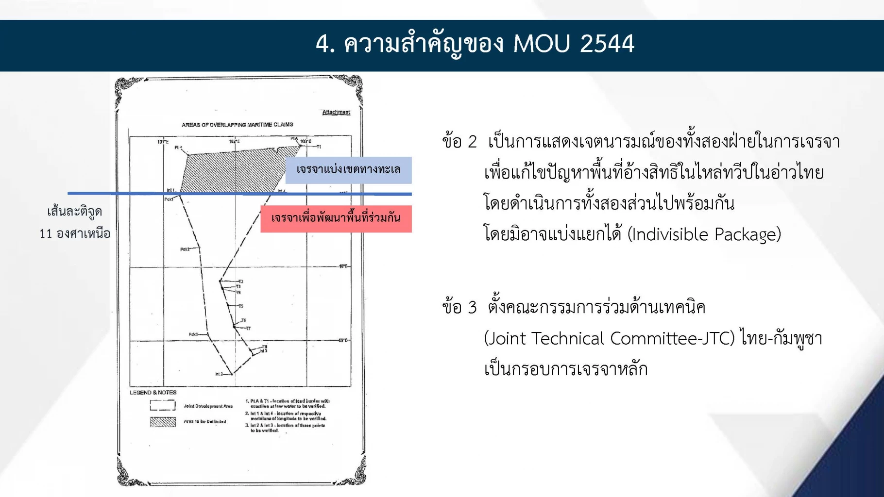 อธิบดีกรมสนธิสัญญาและกฎหมายฯ ยังเปิดเผยความคืบหน้าในการเจรจาแก้ไขปัญหาข้อพิพาทดังกล่าวว่า MOU44 ถือเป็นตัวกำหนดกฎเกณฑ์ที่ไทยจะใช้ในการเจรจา เพราะมีการกำหนดกรอบพื้นที่ทับซ้อน 26,000 ตารางกิโลเมตร แบ่งเป็น 2 พื้นที่หลัก ได้แก่ พื้นที่เหนือเส้นละติจูด 11 องศาเหนือ เพื่อคุยพื้นที่แบ่งเขตทางทะเล และพื้นที่ใต้เส้นละติจูด 11 องศาเหนือให้คุยเรื่องการพัฒนาพื้นที่ร่วมกัน โดยมีเงื่อนไขว่า จะต้องเจรจาทั้ง 2 เรื่องไปพร้อมกันไม่สามารถแบ่งแยกได้ เพราะเส้นอ้างสิทธิเป็นเส้นเดียวกัน จึงต้องคุยเขตทางทะเลเพื่อให้เกิดความชัดเจน และเป็น 2 ผลประโยชน์ที่จะต้องรักษา และสร้างกลไกการเจรจาที่ให้มี JTC ที่มีความละเอียดอ่อน และซับซ้อน จึงได้ใช้หน่วยงานเฉพาะ และจะมีคณะกรรมการย่อย ๆ ลงไปอีกด้วย ซึ่ง MOU44 นี้ เป็นโอกาสที่ทำให้ไทยได้รักษาสิทธิตามกฎหมายระหว่างประเทศ ทั้งสิทธิการแบ่งเขต และการพัฒนาร่วม ซึ่งวิธีตาม MOU44 เป็นวิธีเดียว ที่จะทำให้ประเทศไทยบรรลุผลประโยชน์สูงสุดของประเทศได้