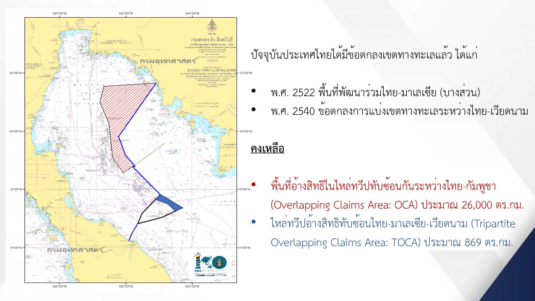 ''มีการกำหนดไว้ในข้อ 5 ของ MOU ว่า ภายใต้เงื่อนไขการมีผลบังคับใช้ของการแบ่งเขต สำหรับการอ้างสิทธิทางทะเล ของภาคีผู้ทำสัญญาในพื้นที่ที่ต้องมีการแบ่งเขต บันทึกความเข้าใจนี้ จะไม่มีผลกระทบต่อการอ้างสิทธิทางทะเลแต่ละภาคีของผู้ทำสัญญา หมายความว่า การอ้างสิทธิของแต่ละฝ่ายก็จะยังคงอยู่ตามกฎหมาย ผลสำเร็จของการเจรจาจะเป็นอย่างไร จะไม่เป็นการทำลายการอ้างสิทธิ ไทยจึงต้องรักษาสิทธิการอ้างสิทธินี้ ไทยไม่ต้องตกลงอะไรทั้งนั้น จนกว่าจะมั่นใจได้ว่า สิ่งที่ไทยได้ ได้สมประโยชน์ของไทย ดังนั้น ไทยจึงไม่เป็นการยอมรับการอ้างสิทธิของกัมพูชา และกัมพูชาเอง ก็ไม่ได้ยอมรับการอ้างสิทธิของไทย'' อธิบดีกรมสนธิสัญญาและกฎหมายฯ ยืนยัน