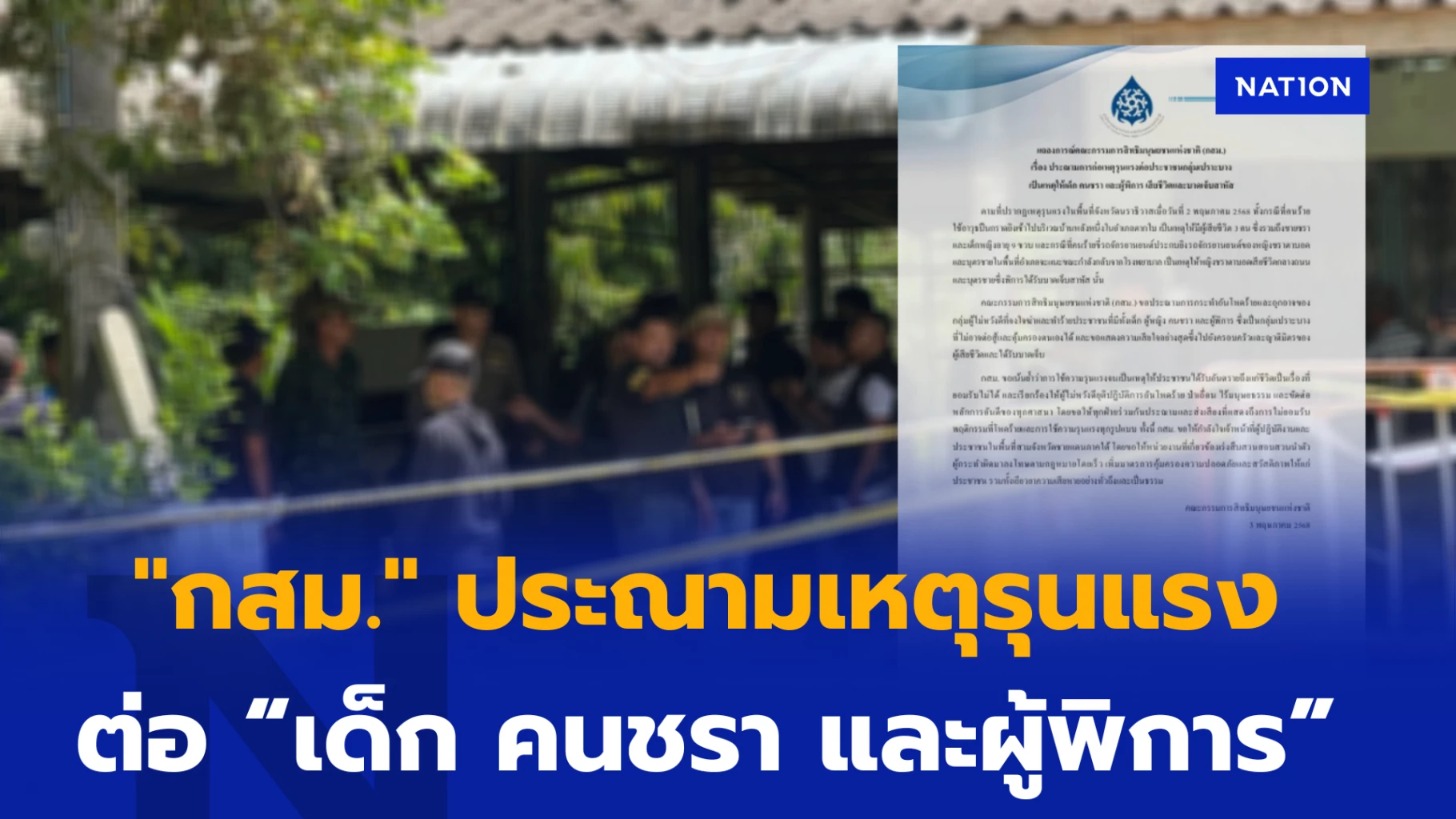 คณะกรรมการสิทธิมนุษยชนแห่งชาติ (กสม.) ขอประณามการกระทำอันโหดร้ายและอุกอาจของกลุ่มผู้ไม่หวังดีที่จงใจฆ่าและทำร้ายประชาชนที่มีทั้งเด็ก ผู้หญิง คนชรา และผู้พิการ ซึ่งเป็นกลุ่มเปราะบางที่ไม่อาจต่อสู้และคุ้มครองตนเองได้ และขอแสดงความเสียใจอย่างสุดซึ้งไปยังครอบครัวและญาติมิตรของผู้เสียชีวิตและได้รับบาดเจ็บ
