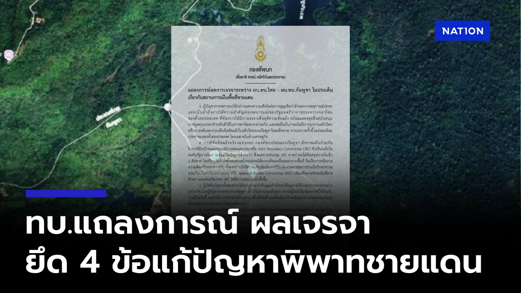 4. การพบปะเจรจาระหว่างผู้บัญชาการทหารบกไทยและกัมพูชาในครั้งนี้ บรรยากาศการพูดคุยเป็นไปด้วยดี สามารถบรรลุข้อตกลงในการถอนกำลังออกจากจุดที่ปะทะ และคงกำลังอยู่ในที่ตั้งเดิมรอผลการประชุมคณกรรมาธิการเขตแดนร่วม JBC ในระหว่างนี้ ผู้บังคับบัญชาทั้งสองฝ่ายจะกำกับดูแลกำลังพลให้อยู่ภายใต้กรอบการเจรจาอย่างเคร่งครัด