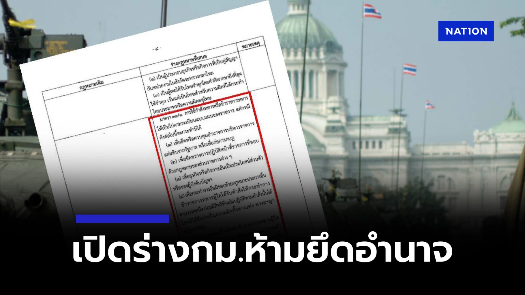สำหรับประเด็น การห้ามใช้กำลังทหารยึดอำนาจรัฐบาล ระบุไว้ใน มาตรา ๓๓/๑ การใช้กำลังทหารหรือข้าราชการทหารให้เป็นไปตามระเบียบแบบแผนของราชการ แต่กรณีดังต่อไปนี้จะกระทำมิได้