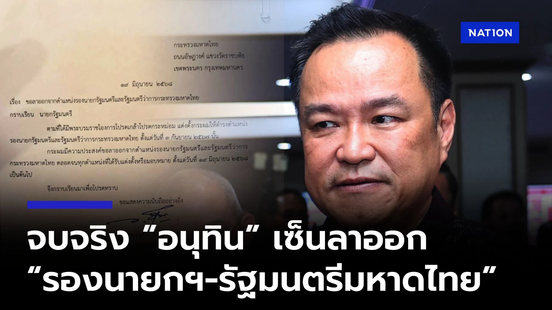 มีความประสงค์ขอลาออกจากทั้งสองตำแหน่ง ที่ได้รับแต่งตั้งหรือมอบหมาย ตั้งแต่วันที่ 19 มิถุนายน 2568 เป็นต้นไป ลงชื่อ นายอนุทิน ชาญวีรกูล