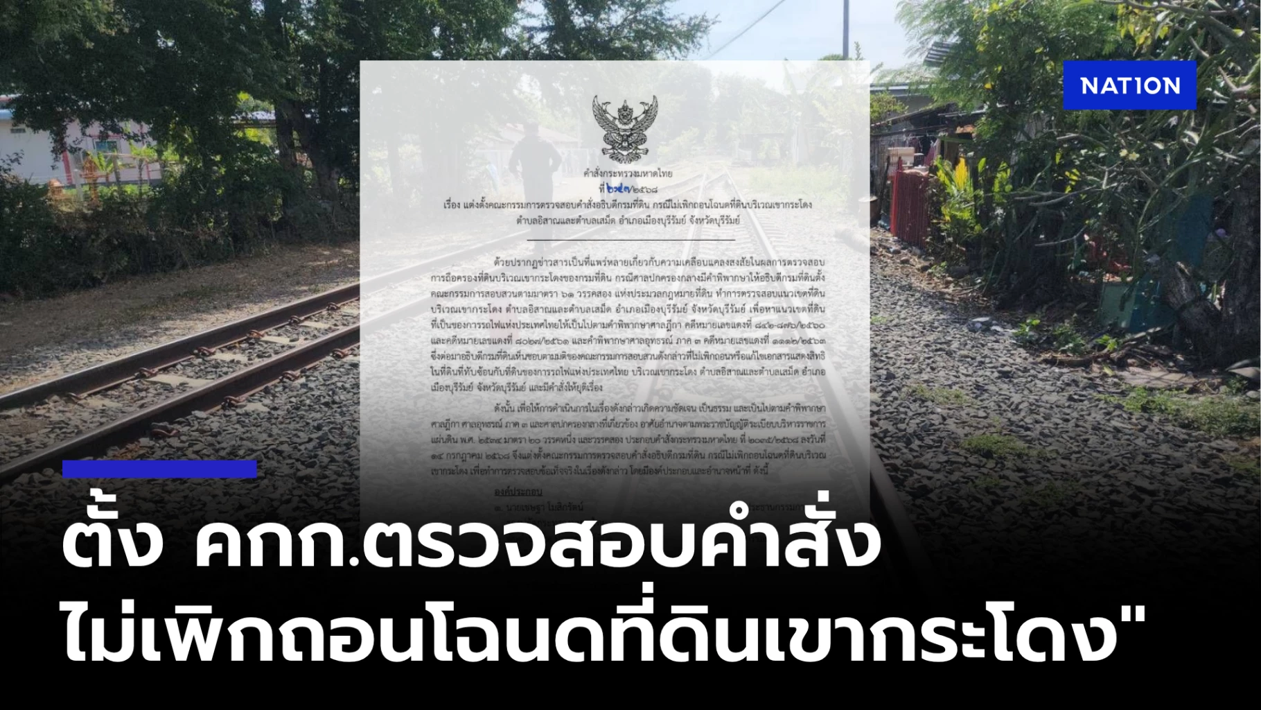 โดยมีรายระเอียดดังนี้ ด้วยปรากฏข่าวสารเป็นที่แพร่หลายเกี่ยวกับความเคลือบแคลงสงสัยในผลการตรวจสอบ การถือครองที่ดินบริเวณเขากระโดงของกรมที่ดิน กรณีศาลปกครองกลางมีคำพิพากษาให้อธิบดีกรมที่ดินตั้งคณะกรรมการสอบสวนตามมาตรา 61 วรรคสอง แห่งประมวลกฎหมายที่ดิน ทำการตรวจสอบแนวเขตที่ดินบริเวณเขากระโดง ตำบลอิสาณและตำบลเสม็ด อำเภอเมืองบุรีรัมย์ จังหวัดบุรีรัมย์ เพื่อหาแนวเขตที่ดินที่เป็นของการรถไฟแห่งประเทศไทยให้เป็นไปตามคำพิพากษาศาลฎีกา คดีหมายเลขแดงที่ 842-876/2560 และคดีหมายเลขแดงที่ 8027/2561 และคำพิพากษาศาลอุทธรณ์ ภาค 3 คดีหมายเลขแดงที่ 1112/2563