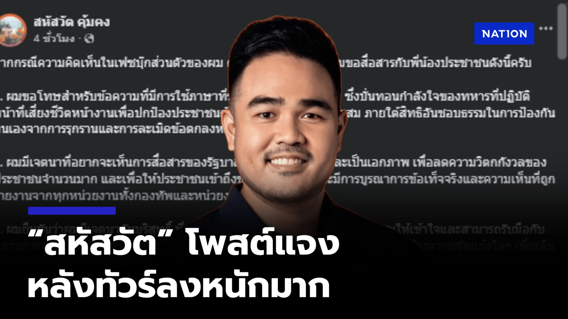 ล่าสุด นายสหัสวัต ได้โพสต์ผ่านเฟซบุ๊กอีกแอคเคาท์ เพื่อชี้แจงกรณีดังกล่าว โดยระบุว่า