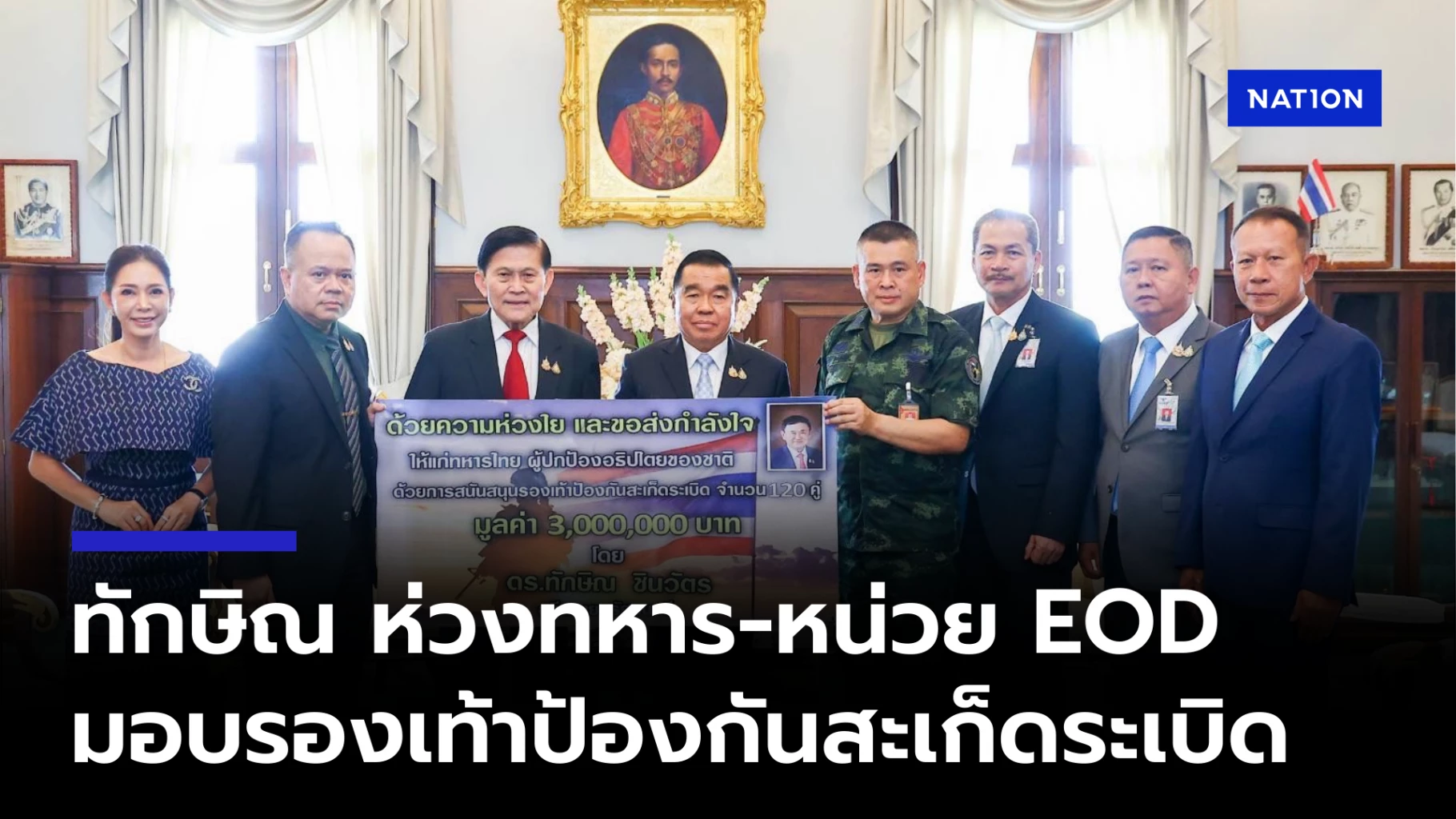 15 สิงหาคม 2568 พล.ต.ต.สุรสิทธิ์ สังขพงศ์ ผู้ช่วยรัฐมนตรีประจำสำนักนายกรัฐมนตรี และประธานนักเรียนเตรียมทหารรุ่น 10 เปิดเผยว่า นายทักษิณ ชินวัตร อดีตนายกรัฐมนตรี มีความห่วงใยทหารชุดลาดตระเวนตามแนวชายแดนไทย-กัมพูชา และหน่วยเก็บกู้และตรวจพิสูจน์วัตถุระเบิด หรือที่เรียกกันทั่วไปว่า EOD (Explosive Ordnance Disposal) ที่ต้องเผชิญกับการเหยียบทุ่นระเบิดจนได้รับบาดเจ็บและสูญเสียขา จึงมีความประสงค์ที่จะมอบ “รองเท้าป้องกันสะเก็ดระเบิด” ซึ่งมีนวัตกรรมสำคัญในการเพิ่มความปลอดภัยและรักษาอวัยวะสำคัญให้กับทหารที่ปฏิบัติภารกิจในพื้นที่เสี่ยงภัย และหน่วย EOD ที่ต้องเผชิญกับทุ่นระเบิด