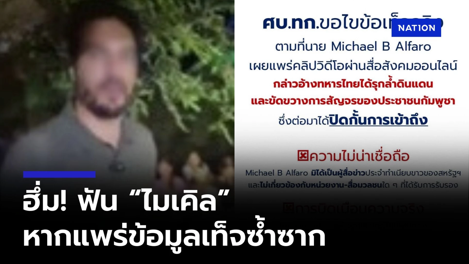 17 สิงหาคม 2568 พล.ร.ต.สุรสันต์ คงสิริ โฆษกศูนย์เฉพาะกิจบริหารสถานการณ์บริเวณชายแดนไทย-กัมพูชา (ศบ.ทก.) ชี้แจงข้อกล่าวหาที่บิดเบือนเกี่ยวกับการรุกล้ำดินแดนกัมพูชาของกองกำลังไทย ตามที่นาย Michael B Alfaro(ไมเคิล อัลฟาโร) กล่าวอ้างว่ากองกำลังทหารไทยได้รุกล้ำดินแดนและขัดขวางการสัญจรของประชาชนกัมพูชาในพื้นที่ชายแดน จากนั้นได้ปิดกั้นการเข้าถึง สะท้อนเจตนาไม่บริสุทธิ์ ว่า จากการตรวจสอบ นาย Michael B Alfaro มิได้มีสถานะเป็นผู้สื่อข่าวประจำทำเนียบขาวของสหรัฐอเมริกา และไม่เกี่ยวข้องกับหน่วยงานทางการ หรือ สื่อมวลชนใดๆ ที่ได้รับการรับรอง บริษัทที่ก่อตั้งขึ้นเพิ่งจัดตั้งในปีปัจจุบัน และยังมีข้อบกพร่องด้านความน่าเชื่อถือหลายประการ เนื้อหาที่เผยแพร่จึงไม่อาจถือเป็นข้อมูลที่ได้รับการตรวจสอบตามมาตรฐานสื่อสากล แต่เป็นเพียงความเห็นส่วนบุคคลที่ปราศจากหลักฐานรองรับ