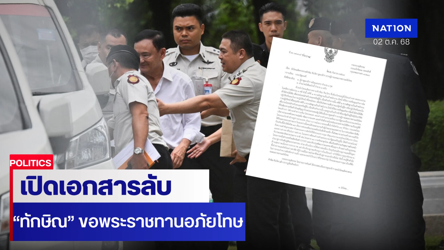 2 ตุลาคม 2568 ผู้สื่อข่าวรายงานจากกระทรวงยุติธรรมว่า หลังมีกระแสข่าวสะพัดในช่วงสัปดาห์ที่ผ่านมา กรณี นายทักษิณ ชินวัตร อดีตนายกรัฐมนตรี ได้ทำหนังสือถึงกรมราชทัณฑ์ เพื่อขอพระราชทานอภัยโทษเป็นการเฉพาะตัว ซึ่งถือเป็นการขอพระราชทานอภัยโทษ รอบสอง