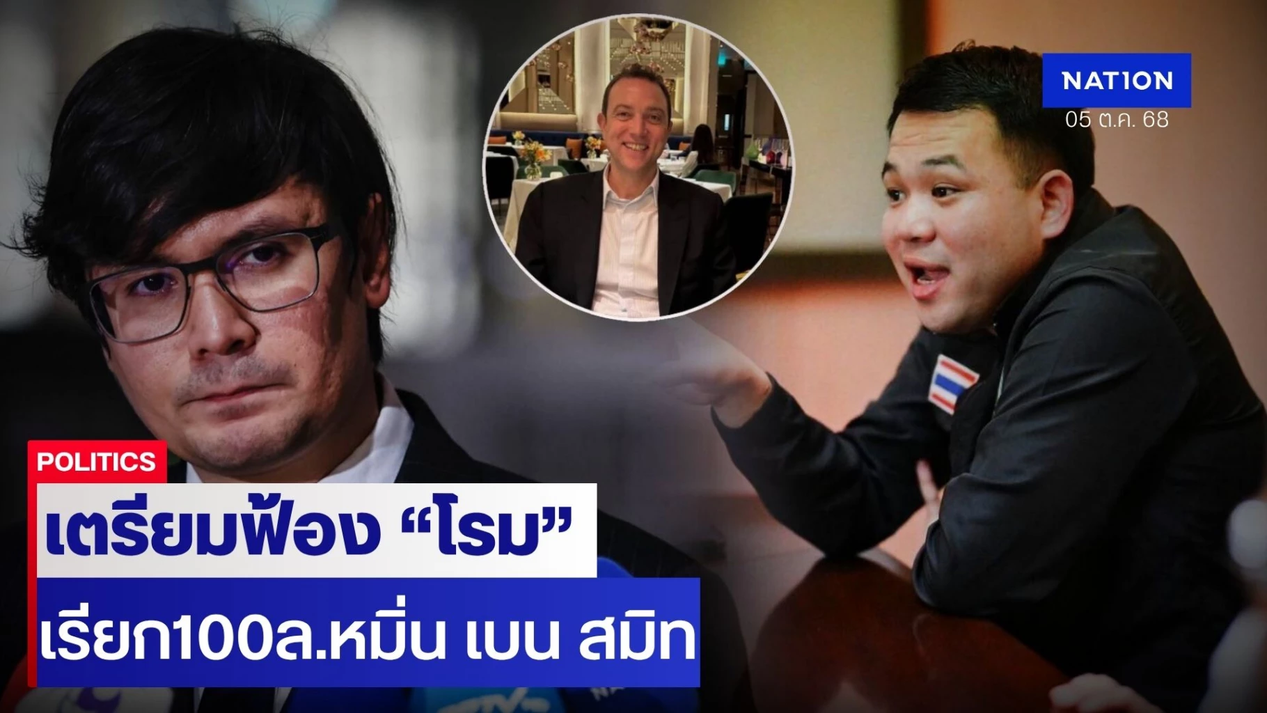ณ ศาลอาญารัชดานายธนดล สุวัณณะฤทธิ์ ผู้รับมอบอำนาจจาก นายเบน สมิท (Benjamin Mauerberger) จะยื่นฟ้องร้องดำเนินคดีกับนายรังสิมันต์ โรม สส.บัญชีรายชื่อ พรรคประชาชน ในข้อหาหมิ่นประมาท โดยการโฆษณา พร้อมทั้งฟ้องเรียกร้องค่าเสียหายทางแพ่งเป็นจำนวนเงิน 100 ล้านบาท