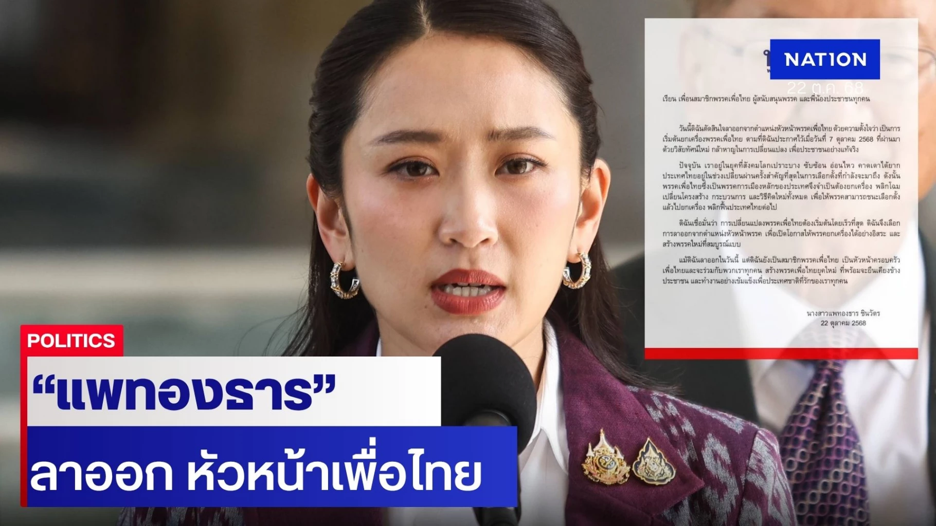 22 ตุลาคม 2568 นางสาวแพทองธาร ชินวัตร ประกาศลาออกจากตำแหน่งหัวหน้าพรรคเพื่อไทย โดยระบุว่า