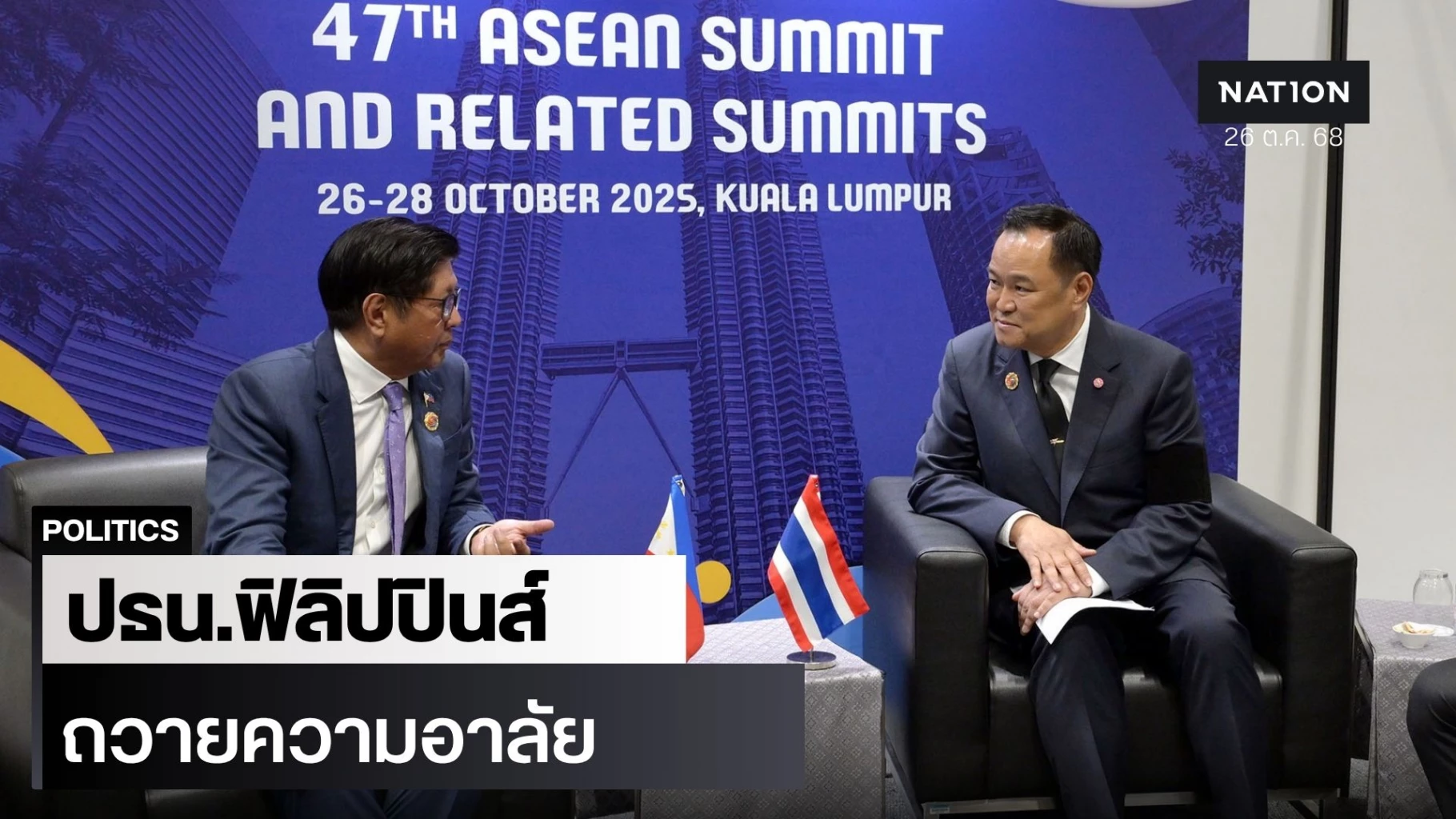 26 ตุลาคม 2568 เวลา 10.20 น. (ตามเวลาท้องถิ่นกรุงกัวลาลัมเปอร์ ซึ่งเร็วกว่ากรุงเทพฯ 1 ชม.) ณ ห้อง 2 Hall 7A ชั้น 3 ศูนย์ประชุม KLCC กรุงกัวลาลัมเปอร์ ประเทศมาเลเซีย นายอนุทิน ชาญวีรกูล นายกรัฐมนตรีและรัฐมนตรีว่าการกระทรวงมหาดไทย หารือทวิภาคีกับนายแฟร์ดีนันด์ โรมูอัลเดซ มาร์โคส จูเนียร์ (H.E. Mr. Ferdinand Romualdez Marcos Jr.) ประธานาธิบดีแห่งสาธารณรัฐฟิลิปปินส์ ในห้วงการประชุมสุดยอดอาเซียน ครั้งที่ 47 และการประชุมสุดยอดที่เกี่ยวข้อง โดยนายสิริพงศ์ อังคสกุลเกียรติ โฆษกประจำสำนักนายกรัฐมนตรี เปิดเผยสาระสำคัญ ดังนี้