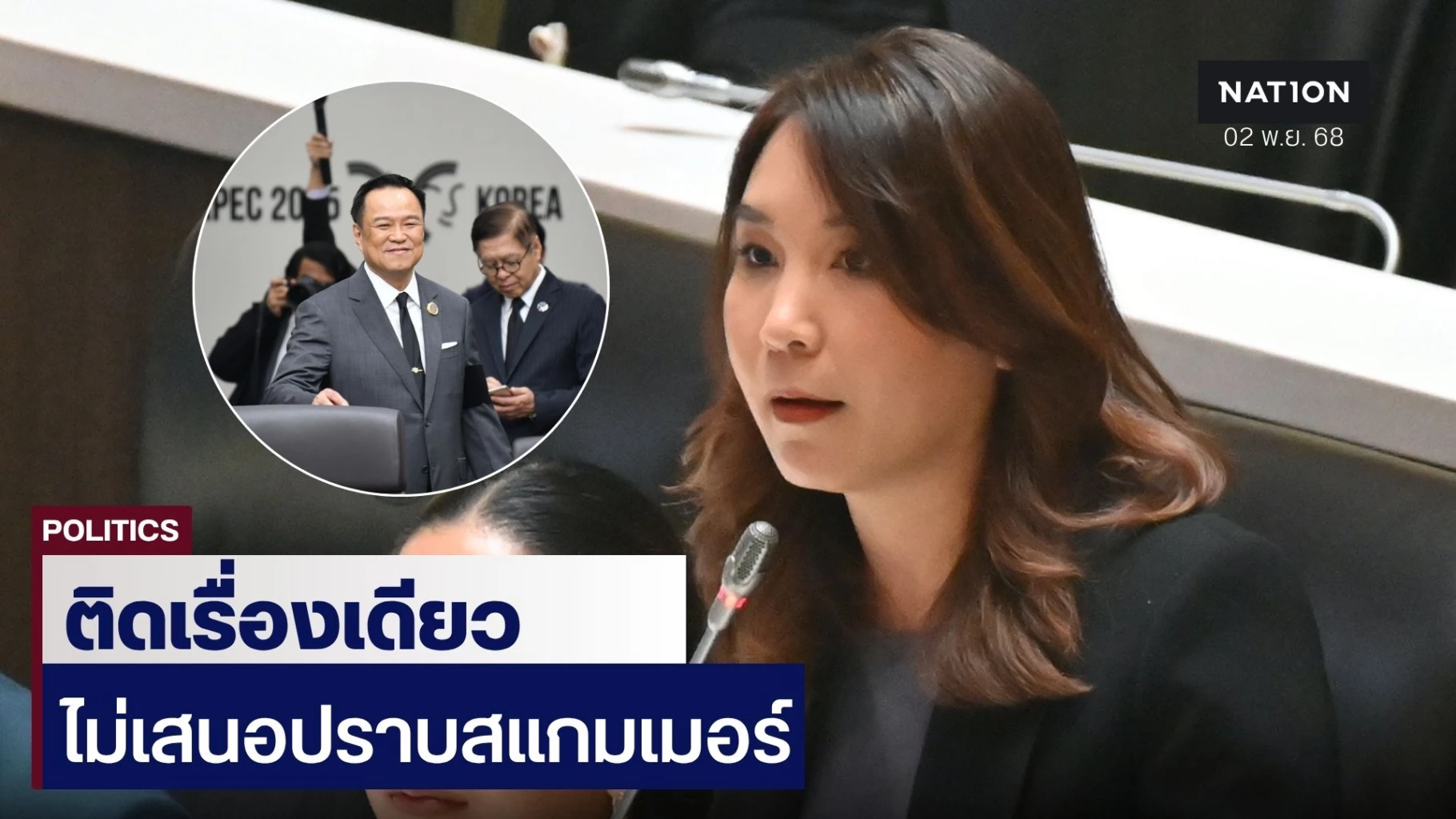 2 พฤศจิกายน 2568 น.ส.ศิริกัญญา ตันสกุล สส.บัญชีรายชื่อ และ รองหัวหน้าพรรคประชาชน ตอบคำถามผู้สื่อข่าวที่ถามว่าการไปประชุมเอเปค หรือ ประชุมความร่วมมือทางเศรษฐกิจเอเชีย-แปซิฟิก ที่เกาหลีใต้ ของนายอนุทิน ชาญวีรกูล นายกรัฐมนตรีและรัฐมนตรีว่าการกระทรวงมหาดไทย ถือว่าผ่านหรือไม่ ว่า ในรอบนี้มีความคืบหน้าหลายเรื่อง ถือว่าผ่าน ได้ทำหน้าที่อย่างสมบูรณ์แบบ