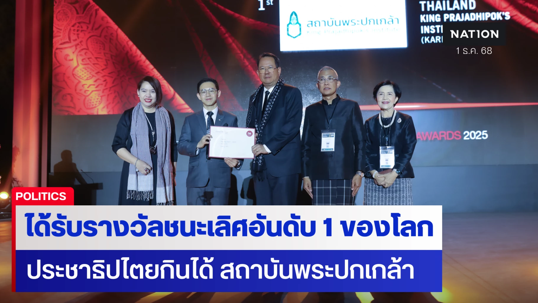 เมื่อเวลา 17.00 น. วันที่ 30 พฤศจิกายน ตามเวลาท้องถิ่น ณ กรุงริยาร์ด ราชอาณาจักรซาอุดีอาระเบีย นายอิสระ เสรีวัฒนวุฒิ เลขาธิการสถาบันพระปกเกล้า พร้อมด้วย นายดามพ์ บุญธรรม เอกอัครราชทูตไทย ณ กรุงริยาร์ด เป็นตัวแทนประเทศไทยขึ้นรับรางวัลบนเวทีโลก กรณีหนังสือ “ประชาธิปไตยกินได้ (Democracy on the Plate)” ซึ่งเป็นผลงานที่จัดทำโดยสถาบันพระปกเกล้า ได้รับรางวัลชนะเลิศอันดับ 1 ของโลก สาขาการทูตอาหาร (Gastrodiplomacy) ในงานประกาศรางวัล Gourmand Awards ครั้งที่ 31 ซึ่งได้รับการยกย่องว่าเป็น “ออสการ์อาหารโลก” ประจำปี 2568 โดยการได้รับรางวัลระดับโลกครั้งนี้ ถือเป็นการแสดงศักยภาพของประเทศไทยในการใช้ “อาหาร” เป็นเครื่องมือทางการทูตและซอฟต์พาวเวอร์ เพื่อสร้างความเข้าใจทางวัฒนธรรมและประชาธิปไตยในระดับสากล