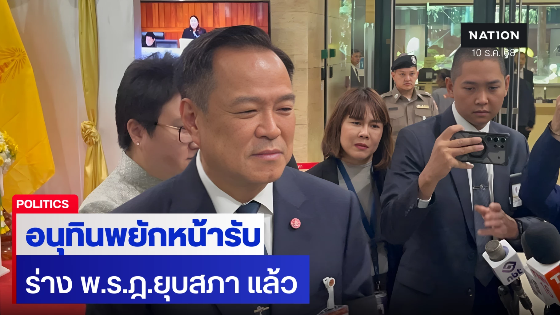 10 ธันวาคม 2568 ที่อาคารรัฐสภา นายอนุทิน ชาญวีรกูล นายกรัฐมนตรี และรัฐมนตรีว่าการกระทรวงมหาดไทย กล่าวถึงกรณีกระแสข่าวยุบสภาขณะนี้ จะส่งผลกระทบต่องานด้านความมั่นคง และเหตุปะทะชายแดนไทยกัมพูชาหรือไม่ว่า
