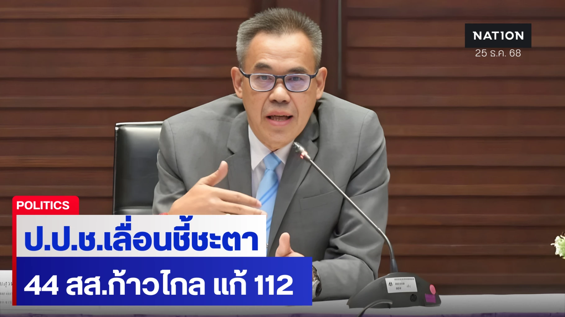 25 ธันวาคม 2568 นายสุรพงษ์ อินทรถาวร รองเลขาธิการคณะกรรมการป้องกันและปราบปรามการทุจริตแห่งชาติ (ป.ป.ช.) รักษาราชการแทนเลขาธิการคณะกรรมการ ป.ป.ช.ในฐานะโฆษก ป.ป.ช.กล่าวถึงกระแสข่าวที่ประชุม ป.ป.ช.เตรียมพิจารณาคดีกล่าวหา 44 อดีต สส.พรรคก้าวไกล ผิดจริยธรรมร้ายแรง กรณีร่วมลงชื่อเสนอแก้ไขประมวลกฎหมายอาญา มาตรา 112 ว่า ยังไม่ได้บรรจุไว้ในวาระการประชุม เนื่องจากผู้ถูกกล่าวหายื่นคำร้องขอความเป็นธรรม จึงต้องดำเนินการตรวจสอบความถูกต้องให้ครบถ้วนก่อน จึงจะเสนอให้ที่ประชุม ป.ป.ช.ดำเนินการต่อไปได้