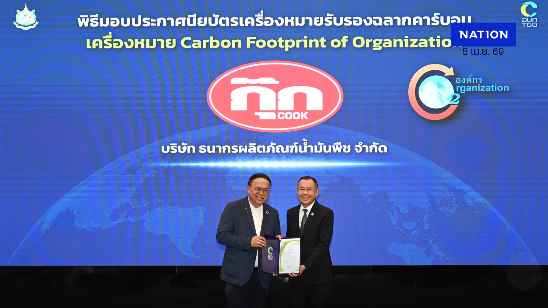 บริษัท ธนากรผลิตภัณฑ์น้ำมันพืช จำกัด โดยนายอดุลย์ เปรมประเสริฐ ประธานเจ้าหน้าที่บริหาร เป็นตัวแทนเข้ารับมอบประกาศนียบัตรเครื่องหมายคาร์บอนฟุตพริ้นท์ขององค์กร (Carbon Footprint for Organization : CFO) จาก ดร.วิจารย์ สิมาฉายา ประธานกรรมการองค์การบริหารจัดการก๊าซเรือนกระจก ในพิธีในพิธีมอบประกาศนียบัตรเครื่องหมายรับรองฉลากคาร์บอน จัดโดยองค์การบริหารจัดการก๊าซเรือนกระจก (องค์กรมหาชน) ณ ห้อง Conference Hall สถาบันเพื่อการยุติธรรมแห่งประเทศไทย (TIJ) ถ.แจ้งวัฒนะ กรุงเทพฯ เมื่อวันที่ 1 เมษายน 2569