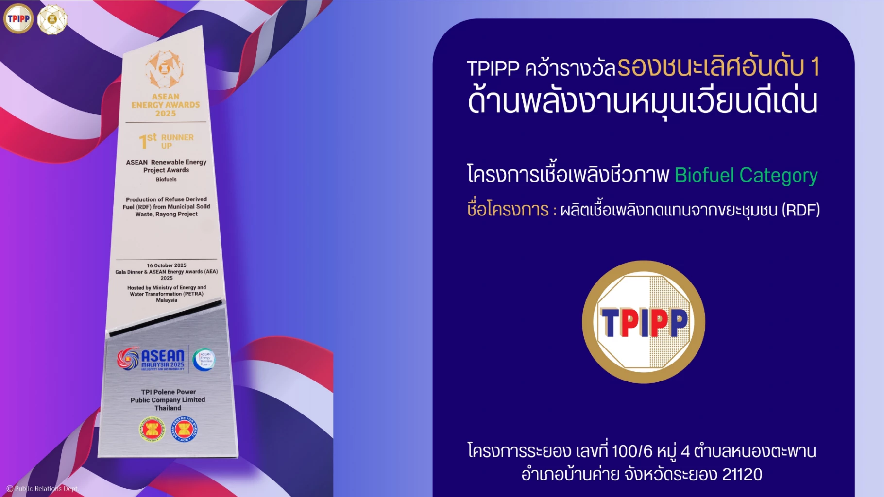 โครงการผลิตเชื้อเพลิงทดแทนจากขยะชุมชน (RDF) โครงการระยอง ตั้งอยู่ เลขที่ 100/6 หมู่ 4 ตำบลหนองตะพาน อำเภอบ้านค่าย จังหวัดระยอง 21120 โดยมีวัตถุประสงค์หลักเพื่อกำจัดขยะ ที่บ่อขยะฝังกลบ (Landfill) เพื่อลดประเด็นปัญหาต่อสิ่งแวดล้อม สามารถกำจัดขยะได้ 600 ตันต่อวัน มีระบบจัดการน้ำขยะด้วยเทคโนโลยีก๊าซชีวภาพ (Biogas) เพื่อผลิตไฟฟ้าใช้ในโครงการ และมีระบบควบคุมกลิ่นและแมลงโดยการผสม TPI Bio-San กับน้ำ ฉีดพ่นประจำทุกวัน เชื้อเพลิง RDF ที่ผลิตได้ส่งให้โรงไฟฟ้าที่จังหวัดสระบุรี เฉลี่ย 126,762 ตันต่อปี ลดการปล่อย CO2 ได้ถึง 11,148.52 ตันต่อปี