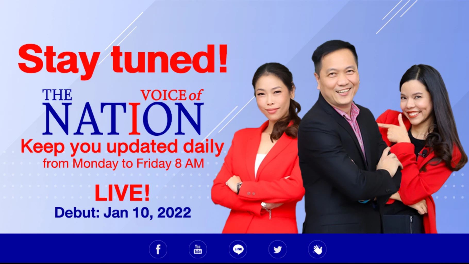 Voice of The Nation เริ่มดีเดย์ วันจันทร์ที่ 10 มกราคม 2565 พบกับรายการคุยข่าวภาคภาษาอังกฤษเต็มรูปแบบบนแพลตฟอร์มออนไลน์ทุกแพลตฟอร์มของ The Nation (www.nationthailand.com) เวลา 08.00-09.00 น. วันจันทร์-วันศุกร์