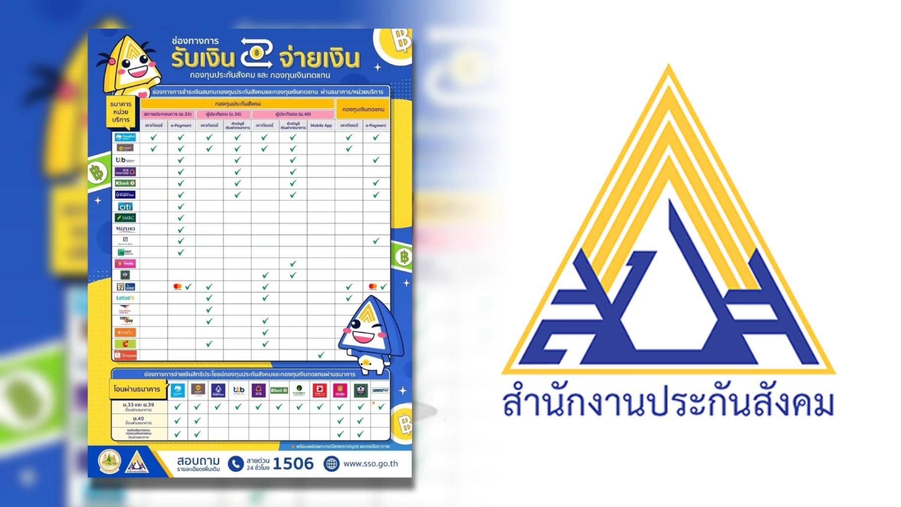 โดยช่องทางรับ-จ่ายเงินสมทบกองทุนประกันสังคมและกองทุนเงินทดแทน ผู้ประกันตน และสถานประกอบการสามารถเลือกนำส่งได้ตามความสะดวกทั้งในรูปแบบ เคาน์เตอร์ธนาคาร เคาน์เตอร์เซอร์วิส E-Payment หักบัญชีเงินฝาก และล่าสุดยังได้เพิ่มช่องทางการชำระผ่าน Mobile App สำหรับผู้ประกันตน ม 40 ที่ไม่สะดวกใช้บริการผ่านทางบัญชีธนาคาร สามารถเลือกนำส่งเงินสมทบผ่าน App Shoppe ได้อีกทางหนึ่งด้วย
