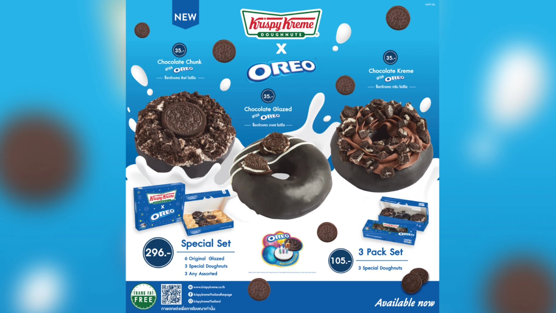 คริสปี้ ครีม (Krispy Kreme) โดนัทสูตรลิขสิทธิ์อันดับ 1 ที่ครองใจคนทั่วโลก ส่งความอร่อยใหม่! กับการคอลแลปส์ครั้งสำคัญเพื่อร่วมฉลองครบรอบ 110 ปี Oreo Cookies กับ “คริสปี้ ครีม x โอรีโอ โดนัท” (Krispy Kreme x Oreo Doughnuts) ที่นำความเข้มข้นของโอรีโอมาสร้างสรรค์เป็นเกลซสูตรพิเศษ กลายเป็น 3 หน้าใหม่สุดลิมิเต็ด “ช็อกโกแลต ชังค์ โอรีโอ โดนัท” (Chocolate Chunk with Oreo Doughnut) จัดเต็มความกรุบกรอบ ทั้งโอรีโอ วิปครีม และโอรีโอครัม, “ช็อกโกแลต เกลซ โอรีโอ โดนัท” (Chocolate Glazed with Oreo Doughnut) โดนัทฟิล ริง สอดไส้โอรีโอวิปครีมแบบเน้นๆ เต็มวง และ “ช็อกโกแลต ครีม โอรีโอ โดนัท” (Chocolate Kreme with Oreo Doughnut) ความเข้มคูณสองของ โอรีโอ เกลซ และโกโก้วิปครีม พร้อมเพิ่มความฟินอีกขั้นด้วยโอรีโอชิ้นใหญ่ให้อร่อยแบบเต็มๆ คำ ในราคาเพียง ชิ้นละ 35 บาท เท่านั้น