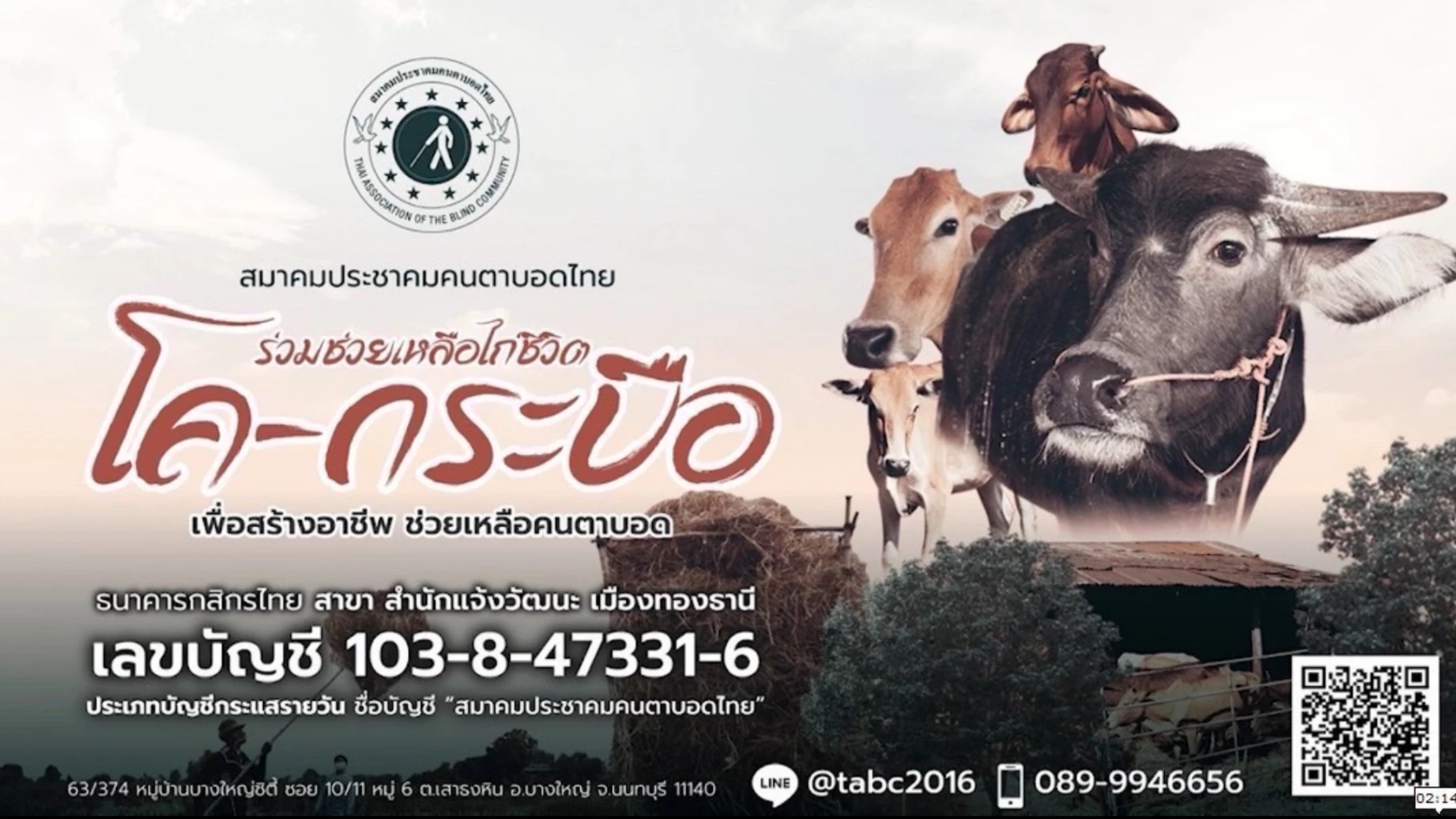สมาคมประชาคมคนตาบอดไทย จึงขอเรียนเชิญทุกท่านร่วมบริจาคสมทบทุนเพื่อไถ่ชีวิตโค-กระบือให้รอดพ้นจากการเชือดของโรงฆ่าสัตว์ โดยท่านสามารถร่วมทำบุญใหญ่ในการให้ชีวิตโดยการไถ่ชีวิตโค-กระบือ ด้วยการโอนเงินผ่านบัญชีธนาคารกสิกรไทย สาขาสำนักแจ้งวัฒนะเมืองทองธานี เลขที่บัญชี 103-8-47331-6 ประเภทบัญชีกระแสรายวัน ชื่อบัญชีสมาคมประชาคมคนตาบอดไทย หรือทุกท่านจะไปไถ่ชีวิตโคกระบือแล้วแจ้งให้สมาคมฯ ไปรับมอบเพื่อนำไปให้คนตาบอดและครอบครัวเลี้ยงเพื่อเป็นอาชีพให้คนตาบอดได้มีรายได้ สามารถติดต่อสมาคมฯ ทางแอพพลิเคชั่นไลน์ไอดี @tabc2016 (อ่านว่า แอด-ที-เอ-บี-ซี-สอง-ศูนย์-หนึ่ง-หก) หรือสแกนคิวอาร์โค้ดไลน์ที่ท่านผู้ชมเห็นอยู่บนหน้าจอนี้ สอบถามรายละเอียดเพิ่มเติมโทร 089-994-6656 หรือติดต่อที่ศูนย์ประสานงานสมาคมประชาคมคนตาบอดไทย ทุกท่านร่วมด้วยช่วยกันนะคะ เพราะเป็นการทำบุญใหญ่ในการให้ชีวิตใหม่แก่โค-กระบือ และยังช่วยสร้างงาน สร้างรายได้ ให้คนตาบอดมีงานทำที่มั่นคง มั่งคั่ง และยั่งยืน เนื่องในเทศกาลวันวิสาขบูชาประจำปี พ.ศ 2565 อีกด้วยค่ะ