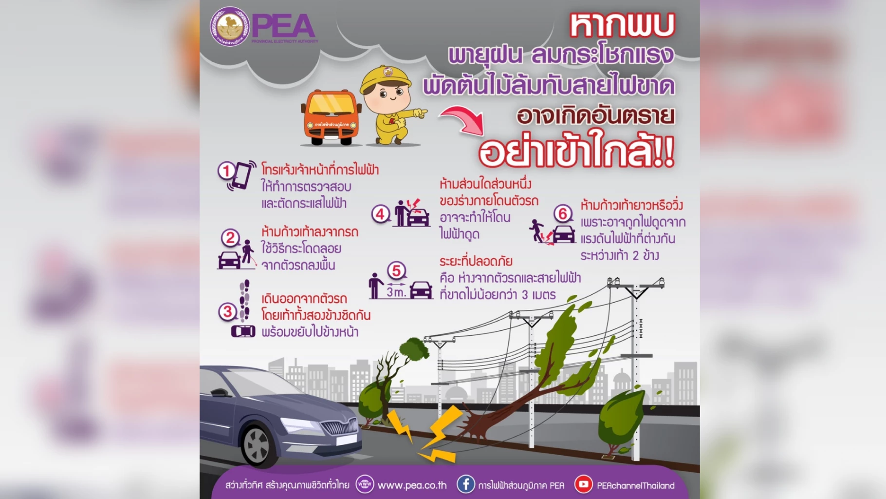 ตามประกาศกรมอุตุนิยมวิทยา แจ้งเตือนมีฝนฟ้าคะนอง การไฟฟ้าส่วนภูมิภาค (PEA) ขอให้ประชาชนติดตามข่าวสารสภาพอากาศ ประกาศเตือนจากหน่วยงานภาครัฐและหน่วยงานที่เกี่ยวข้องอย่างใกล้ชิด หากพบพายุฝนและลมกระโชกแรงพัดต้นไม้ล้มทับสายไฟฟ้าขาดอย่าเข้าใกล้ โทรแจ้งเจ้าหน้าที่การไฟฟ้าส่วนภูมิภาค ให้ทำการตรวจสอบและตัดกระแสไฟฟ้าและปฏิบัติตามข้อแนะนำ ดังนี้