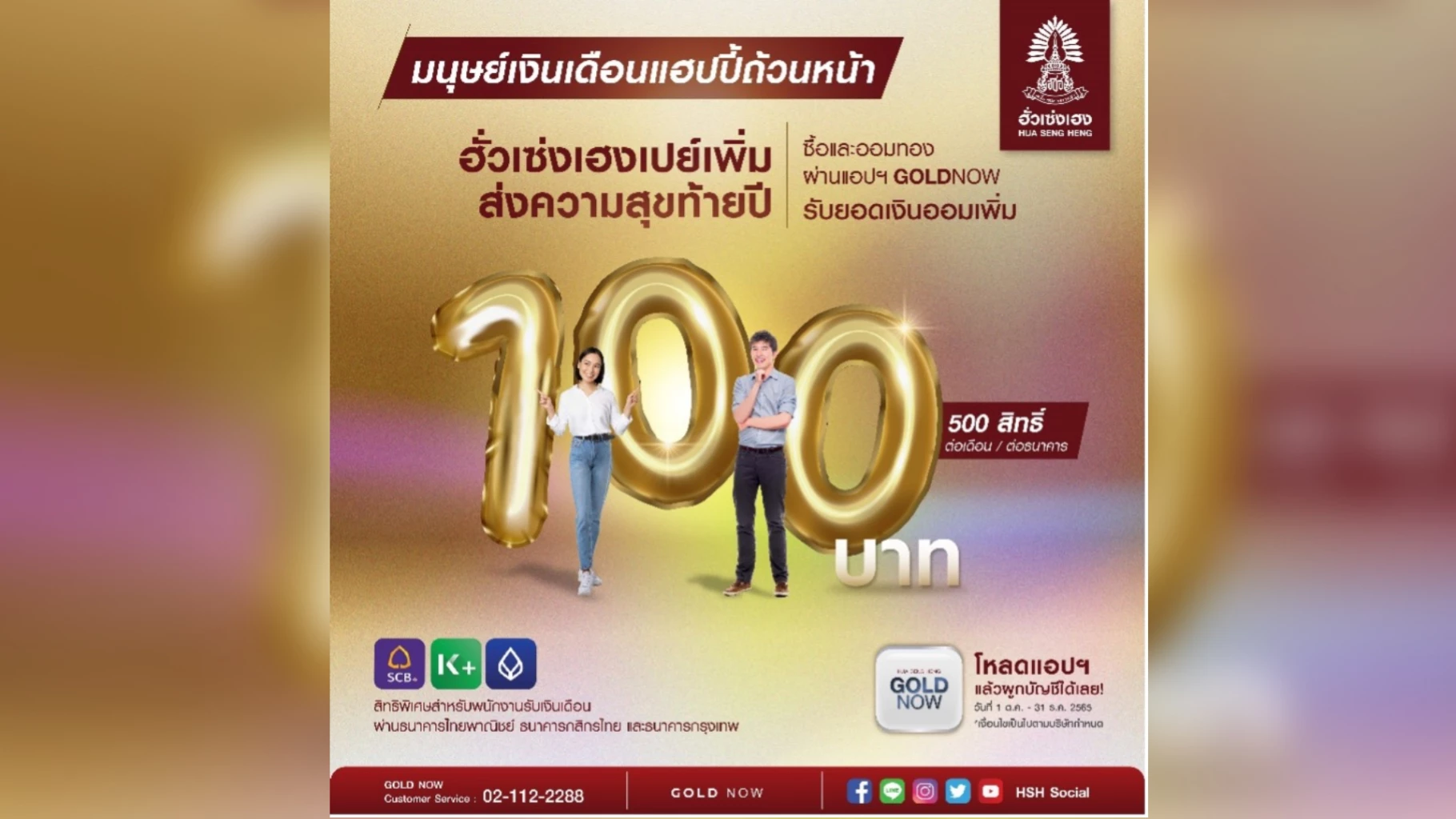 ฮั่วเซ่งเฮง ส่งความสุขท้ายปี มอบของขวัญและสิทธิพิเศษเหนือกว่าใคร เปิดตัวแคมเปญเพื่อสนับสนุนการออม สำหรับพนักงานที่รับเงินเดือนผ่านธนาคารไทยพาณิชย์ ธนาคารกสิกรไทย และธนาคารกรุงเทพ เท่านั้น เพียงซื้อทองผ่านแอปพลิเคชัน GOLD NOW หรือออมทอง ในฟีเจอร์ ออม NOW เป็นครั้งแรก และผูกบัญชีธนาคาร รับยอดเงินออมเพิ่มเข้าสู่บัญชี ออม NOW เป็นจำนวนทองที่เทียบเท่ากับราคา 100 บาท ของราคาทอง ณ วันนั้นๆ เป็นจำนวนทั้งสิ้น 4,500 สิทธิ์