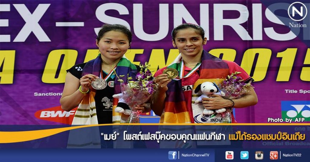 "น้องเมย์" รัชนก อินทนนท์ นักแบดมินตันสาวมือ 8 โลกของไทยโพสต์เฟสบุ๊คขอบคุณแฟนกีฬาไทยที่คอยให้กำลังใจ หลังพ่ายต่อไซน่า เนห์วาล ตบขนไก่อินเดีย 2 เกมรวดคว้าได้เพียงรองแชมป์อินเดีย โอเพน 2015 เมื่อวันอาทิตย์ที่ผ่านมา