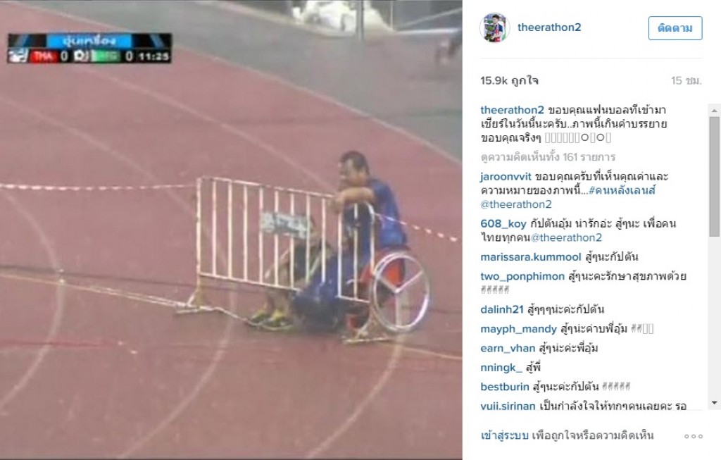 ทำให้ "อุ้ม" ธีราทร บุญมาทัน แบ็กซ้าย กัปตันช้างศึกทีมชาติไทย ออกมาโพสต์บนอินสตาแกรมส่วนตัวชื่นชมให้กับหัวใจของกองเชียร์ทีมชาติไทยรายนี้ว่า ขอบคุณแฟนบอลที่เข้ามาเชียร์ในวันนี้นะครับ..ภาพนี้เกินคำบรรยาย ขอบคุณจริง ๆ