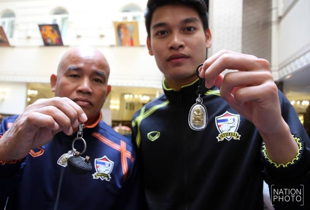 ชาตรี แสงสว่าง เจ้าหน้าที่ทีมชาติไทย เจ้าของ "เสืออุ้มทรัพย์" ของหลวงพ่ออุทัย วัดเกาะตาพุด จ.ราชบุรี เครื่องรางของขลังที่ สมพร ยศ ประตูทีมชาติไทย ชุด ยู-23 นำไปแขวนไว้ที่ตาข่ายประตู เพราะเป็นความเชื่อส่วนบุคคลว่าจะช่วยให้แคล้วคลาด