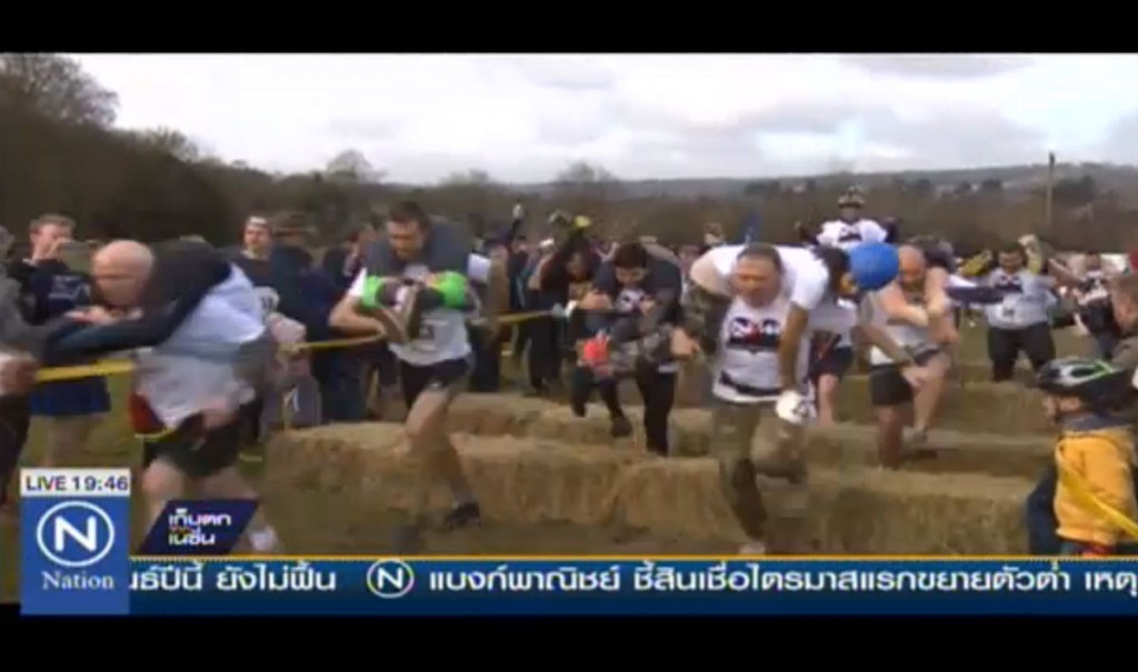 การแข่งขันวิ่งแบกเมียที่ประเทศอังกฤษ เมื่อวันอาทิตย์ที่ผ่านมา ซึ่งปีนี้ แชมป์กลับตกเป็นของคู่สามีภรรยาชาวอเมริกัน - โจนาธาน ชโวเชิร์ต กับ ชาร์ล็อต สง