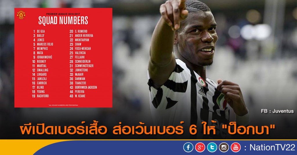"ปีศาจแดง" แมนเชสเตอร์ ยูไนเต็ด ยักษ์ใหญ่แห่งศึกพรีเมียร์ลีก อังกฤษ ประกาศหมายเลขเสื้อของนักเตะที่จะสวมใส่ลงสนาในฤดูกาล 2016/17 ออกมาแล้ว โดย ซลาตัน อิบราฮิโมวิช กองหน้าคนใหม่ชาวสวีดิชได้ใส่เสื้อเบอร์ 9 แทนที่ของ อองโตนี มาร์กซิยัล กองหน้าทีมชาติฝรั่งเศสที่โยกไปใส่หมายเลข 11 ซึ่งเป็นเบอร์เก่าของ ไรอัน กิ๊กส์ ตำนานดาวเตะของสโมสร ขณะที่แข้งใหม่อีก 2 ราย ได้แก่ เอริก ไบญี่ กองหลังทีมชาติไอวอรีโคสต์จะสวมเสื้อหมายเลข 3 ส่วน เฮนริก มัคฮิทาเรียน กองกลางทีมชาติอาร์เมเนียได้เสื้อหมายเลข 22 ด้าน เวย์น รูนีย์ กองกลางกัปตันทีมชาติอังกฤษยังคงใส่เสื้อเบอร์ 10 เหมือนเดิม