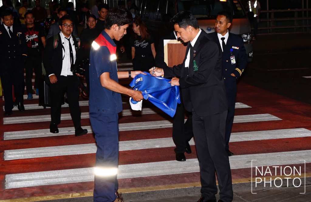 12 T"8"59 "ช้างศึก"นักฟุตบอลทีมชาติไทย พร้อมด้วย "โค้ชซิโก้" เกียรติศักดิ์ เสนาเมือง หัวหน้าผู้ฝึกสอนทีมชาติไทย เดินทางกลับถึงท่าอากาศยานสุวรรณภูมิแล้วโดยสายการบินไทย TG 434 หลังบุกไปพ่ายอินโดนีเซีย 1-2ประตู ในศึกฟุตบอลเอเอฟเอฟ ซูซูกิ คัพ 2016 รอบชิงชนะเลิศ นัดแรก ที่สนามปากันซารี ประเทศอินโดนีเซีย โดยนัดที่2 ทีมชาติไทยจะเปิดบ้านรับการมาเยือนของ อินโดนีเซีย ที่สนาม ราชมังคลากีฬาสถาน ในวันที่ 17 ธันวาคมนี้(ท่าอากาศยานสุวรรณภูมิ (15ธันวาคม59)