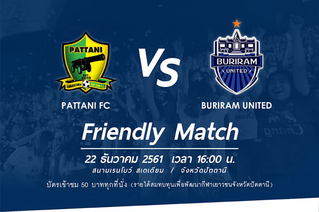โดย "ปราสาทสายฟ้า" บุรีรัมย์ ยูไนเต็ด สโมสรฟุตบอลที่มีปณิธานของสโมสรคือ การทำจิตอาสา และสาธารณประโยชน์ต่อสังคม จะลงอุ่นเครื่องกับ ปัตตานี เอฟซี ในวันเสาร์ที่ 22 ธันวาคม 2561 ที่สนามเรนโบว์ สเตเดียม (จังหวัดปัตตานี) คิกออฟเวลา 16.00 น. บัตรเข้าชมราคา 50 บาททุกที่นั่ง รายได้มอบให้เพื่อการพัฒนากีฬาเยาวชนจังหวัดปัตตานี