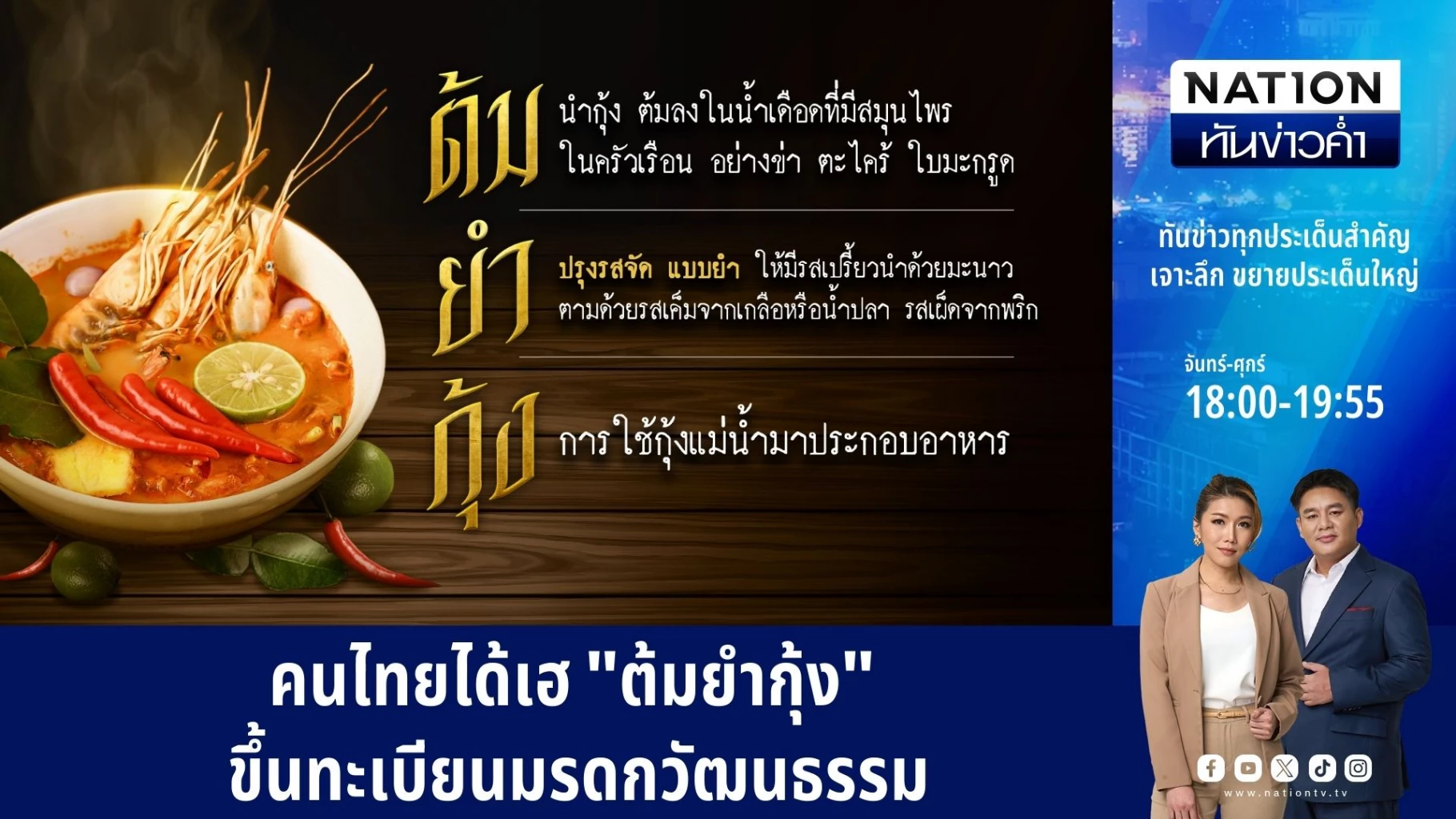 คนไทยได้เฮ "ต้มยำกุ้ง" ขึ้นทะเบียนมรดกวัฒนธรรม | เนชั่นทันข่าวค่ำ | 04 ธ.ค. 67 | PART 1