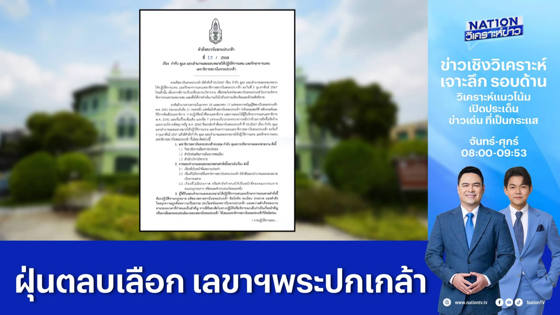 กระบวนการสรรหาเพื่อคัดเลือกแต่งตั้งเลขาธิการสถาบันพระปกเกล้า กลายเป็นข่าวคราวฝุ่นตลบขึ้นมา ซึ่งปีนี้มีกติกาใหม่ คือ ผู้ที่สมควรได้รับการเสนอชื่อ ต้องมีกรรมการสภาสถาบันพระปกเกล้ารับรอง โดยกรรมการ 1 คน รับรองผู้สมควรได้รับการเสนอชื่อแค่ 1 คนเท่านั้น